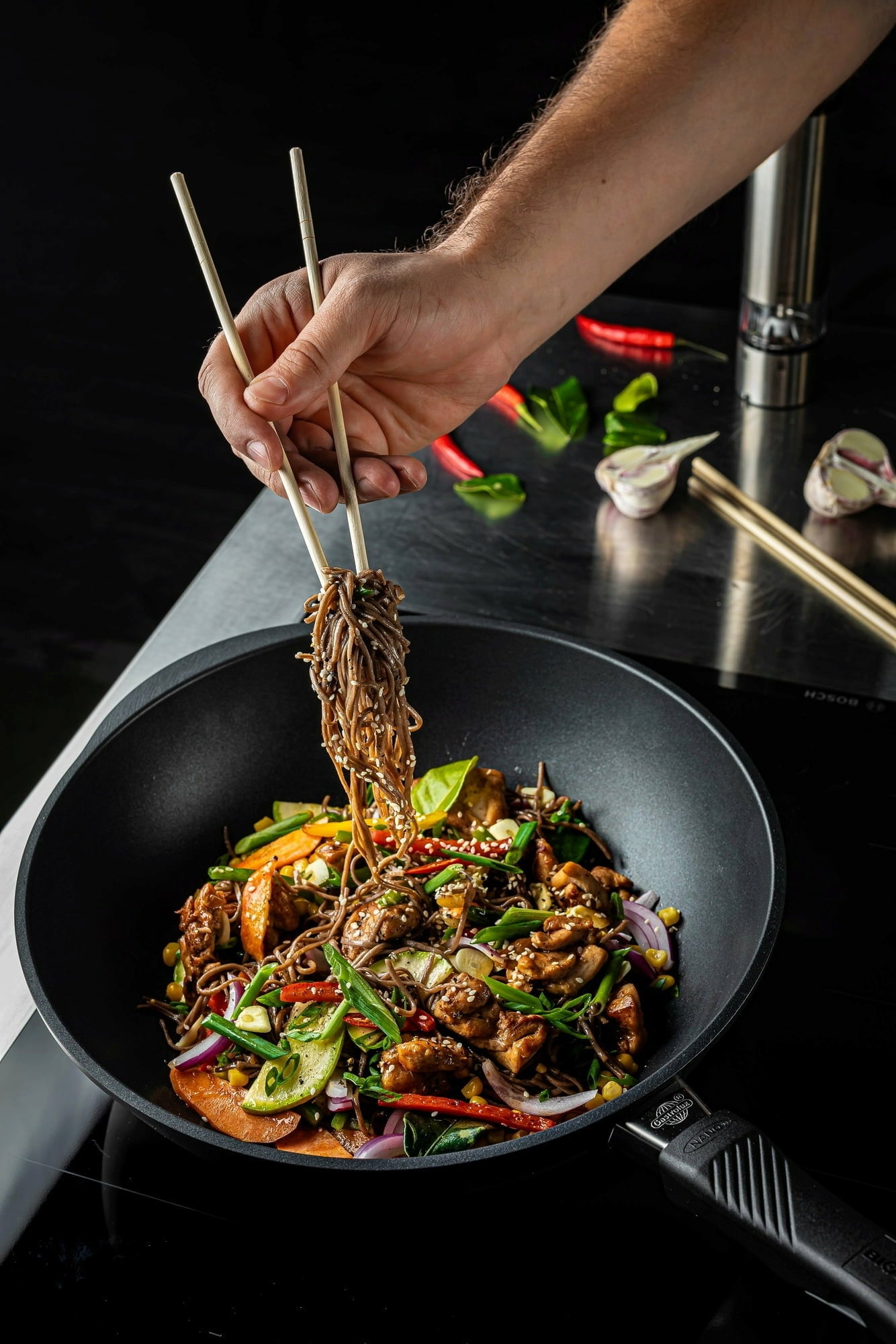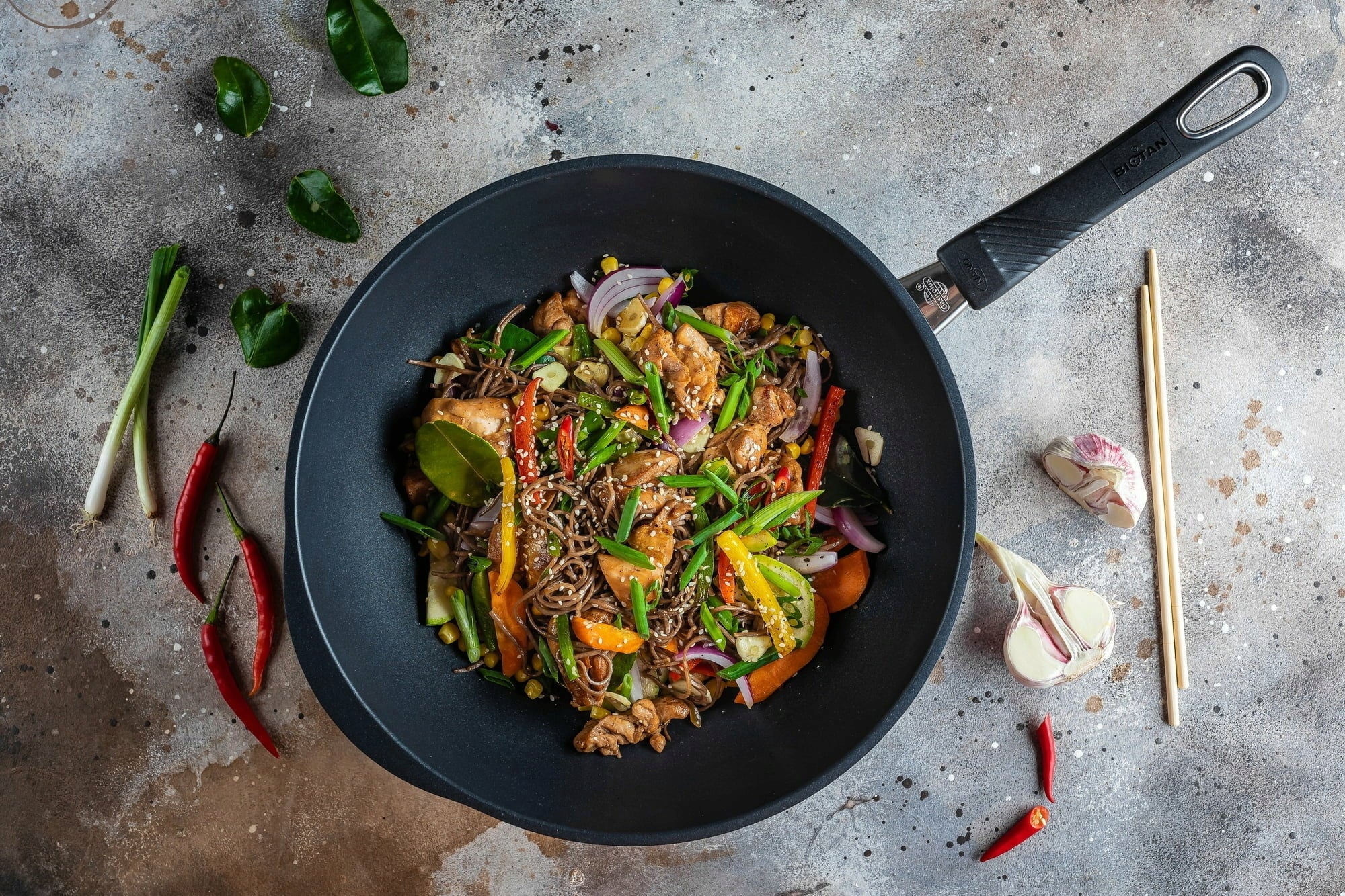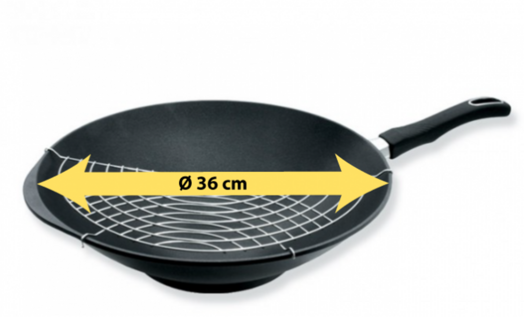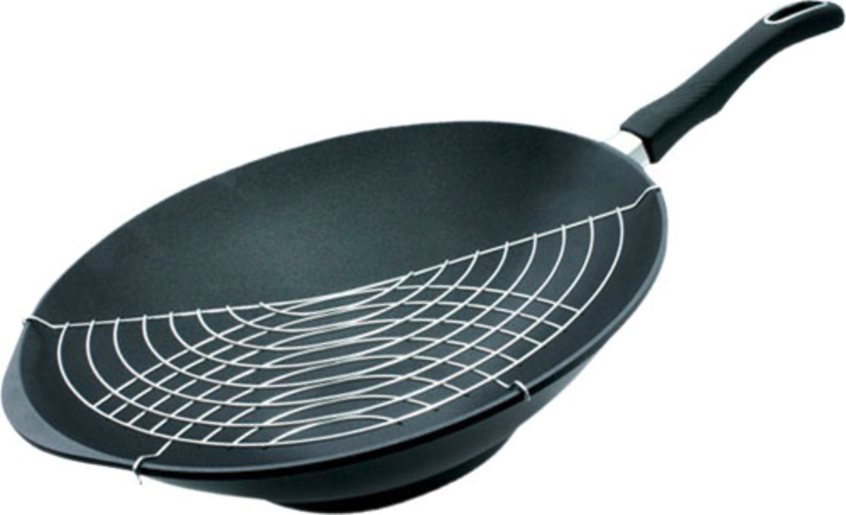In het Verre Oosten behoort de wok al honderden jaren tot de basisuitrusting van elk huishouden. Met dit kookgerei van gegoten aluminium kun je razendsnel verschillende gerechten bereiden met behoud van vitaminen. Het bijgeleverde rooster heeft twee voordelen. Ten eerste kun je er groenten op stomen terwijl je bakt, en ten tweede kun je het gebruiken als een dienblad om eten warm te houden wanneer je ingrediënten met verschillende kooktijden bereidt.