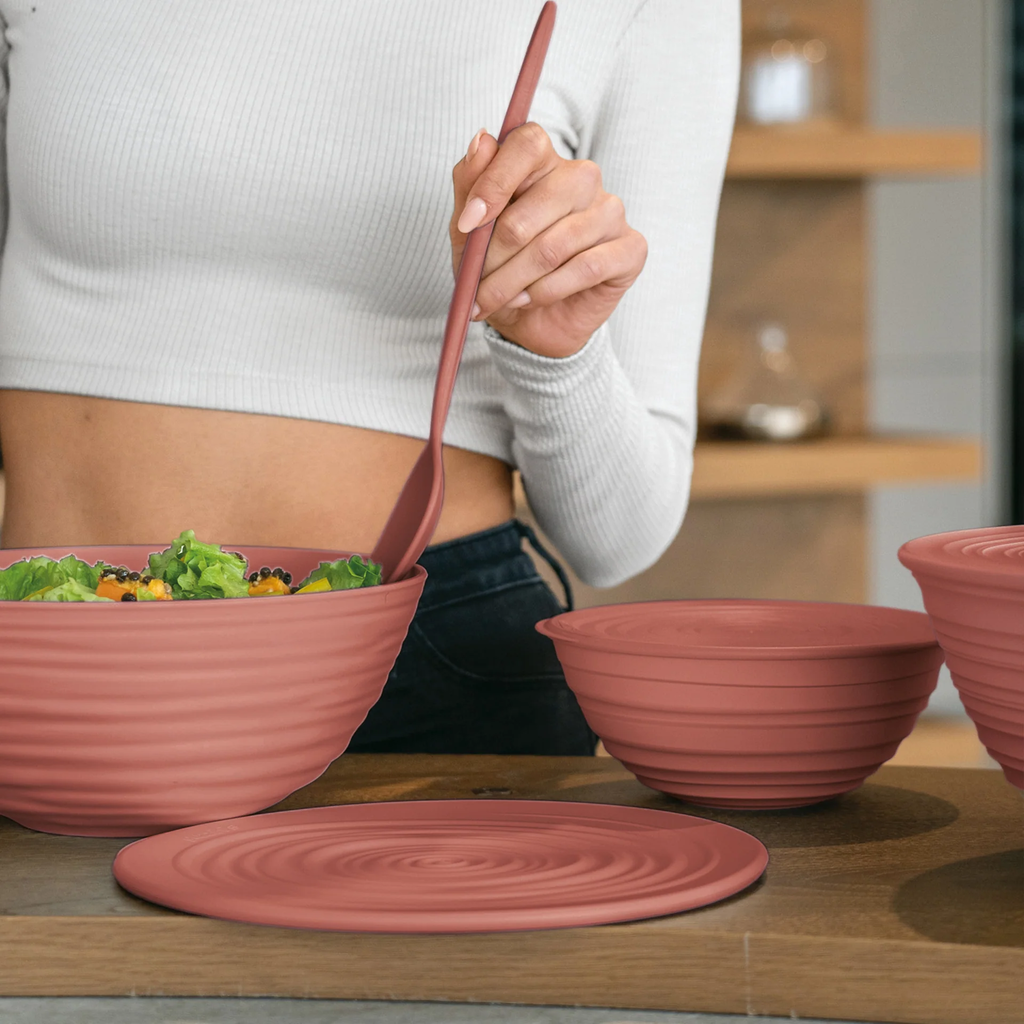 Deze prachtige schaal - gemaakt van gerecyclede wegwerpflessen - maakt niet alleen indruk door zijn aantrekkelijke handgemaakte look in frisse kleuren, maar ook door zijn praktische bruikbaarheid. Dankzij de bijpassende deksel is hij niet alleen geschikt om te serveren, maar ook om in de koelkast te bewaren of mee te nemen - of het nu voor een barbecue met vrienden of een gezellige picknick is. Gemakkelijk schoon te maken en vaatwasmachinebestendig.