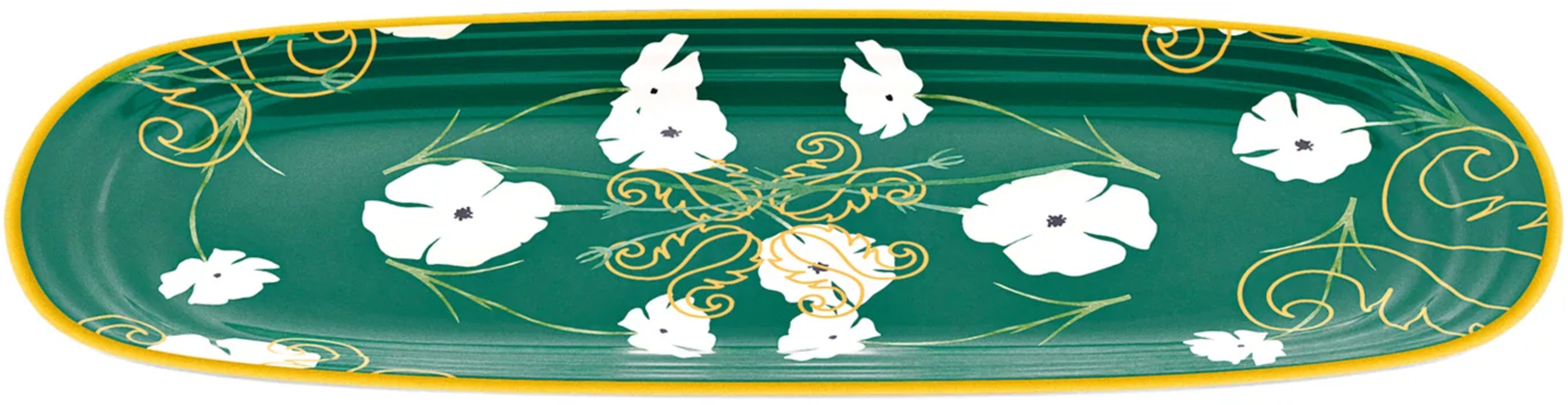 Met de rechthoekige serveerschaal "Fusion" van guzzini kun je je eten vakkundig presenteren! Zijn diepgroene kleur, versierd met delicate witte bloemen en gouden accenten, zal meteen de aandacht van je gasten trekken!