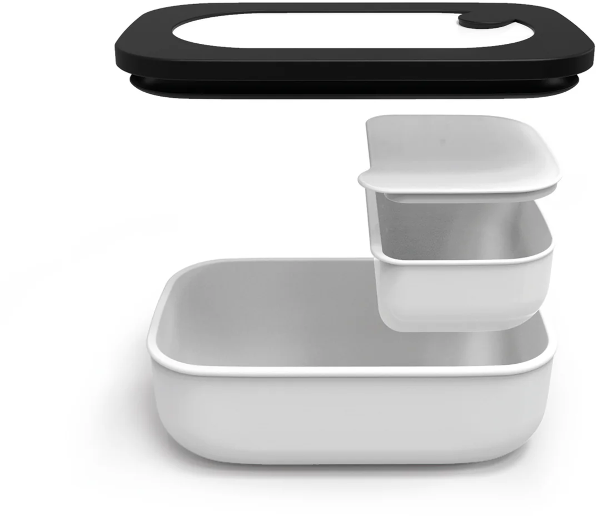Deze snackbox bestaat uit twee rechthoekige bakjes die in elkaar gestapeld kunnen worden, een goed sluitende deksel en bestek. Hij is zo ontworpen dat verschillende etenswaren vervoerd kunnen worden zonder dat ze mengen of smaakvervuiling veroorzaken. De box kan gebruikt worden in de koelkast of vriezer, is vaatwasmachinebestendig en is ook magnetronbestendig dankzij de deksel met klep.