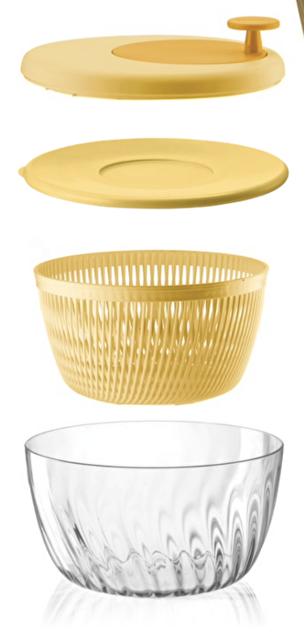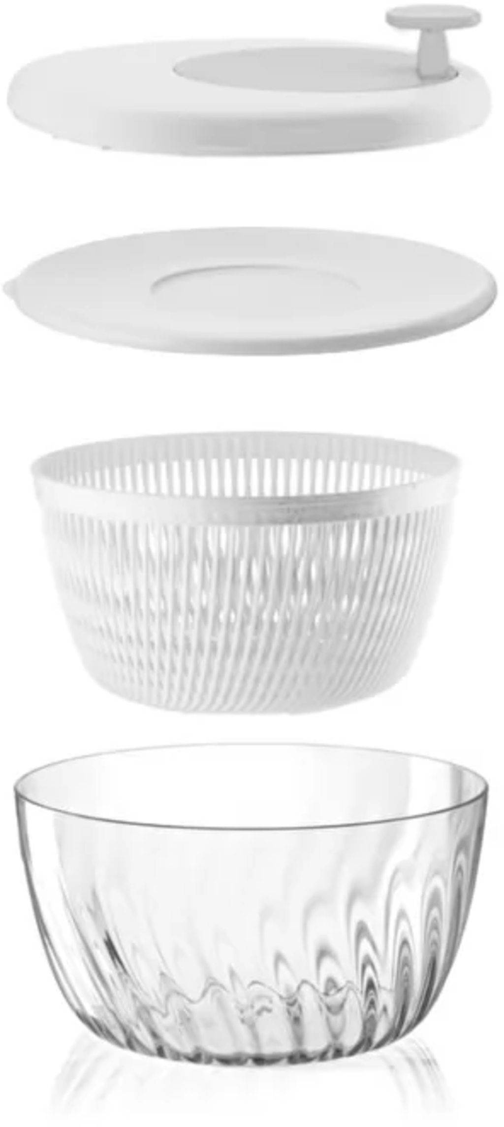 • 4-delige set, bestaande uit slakom, centrifugemand, deksel met zwengel en vershouddeksel