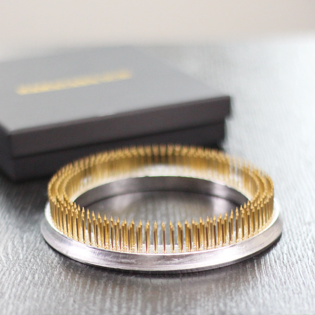 Creëer stijlvolle Ikebana-arrangementen met de Kenzan-ring – het betrouwbare hulpmiddel voor creatieve en stabiele bloemkunst. De ronde vorm en duurzame koperen pinnen zorgen voor een nauwkeurige plaatsing en nodigen uit tot zowel minimalistische als kunstzinnige composities.