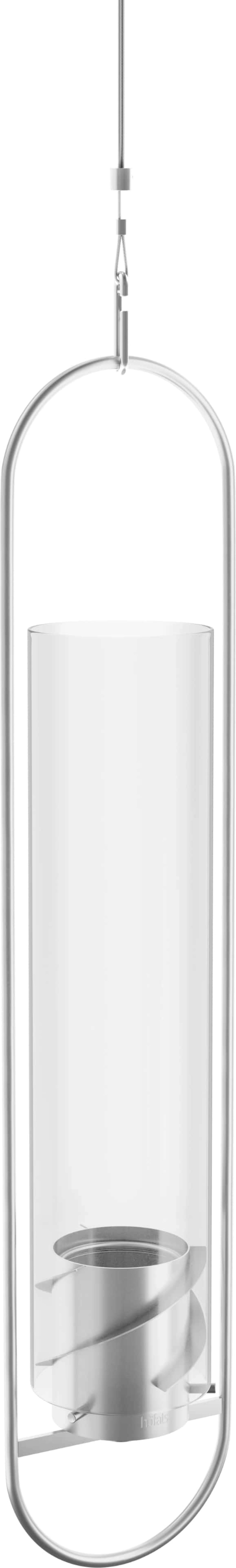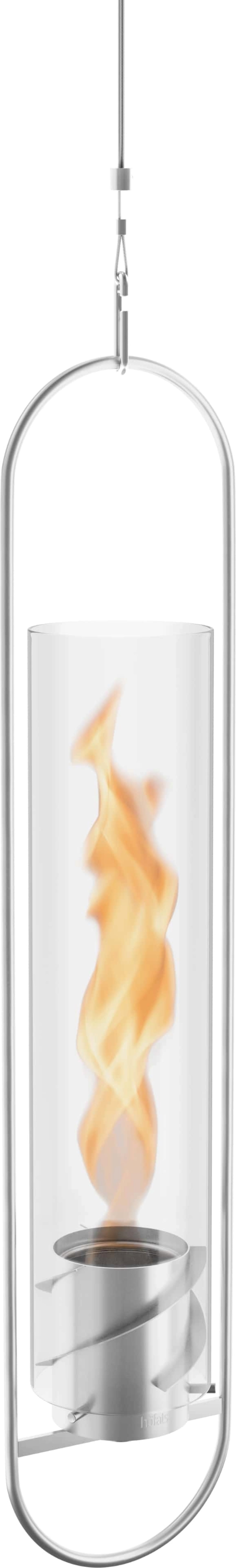 De hangende haard kan zowel binnen als buiten aan een chique, in hoogte verstelbare roestvrijstalen kabel worden bevestigd en zweeft elegant in de lucht, zorgt voor aangename warmte, dansend licht en een gezellige feel-good sfeer.