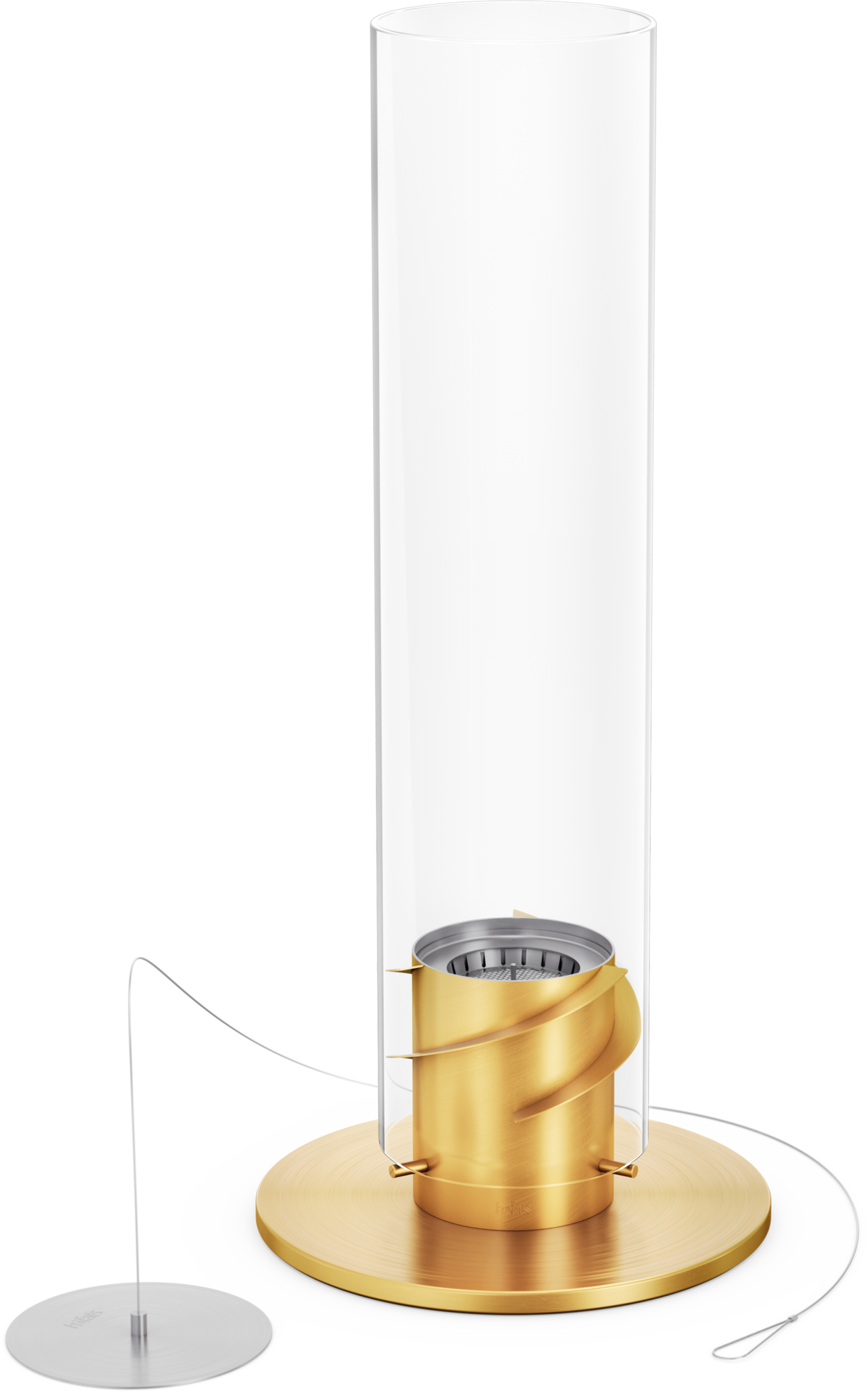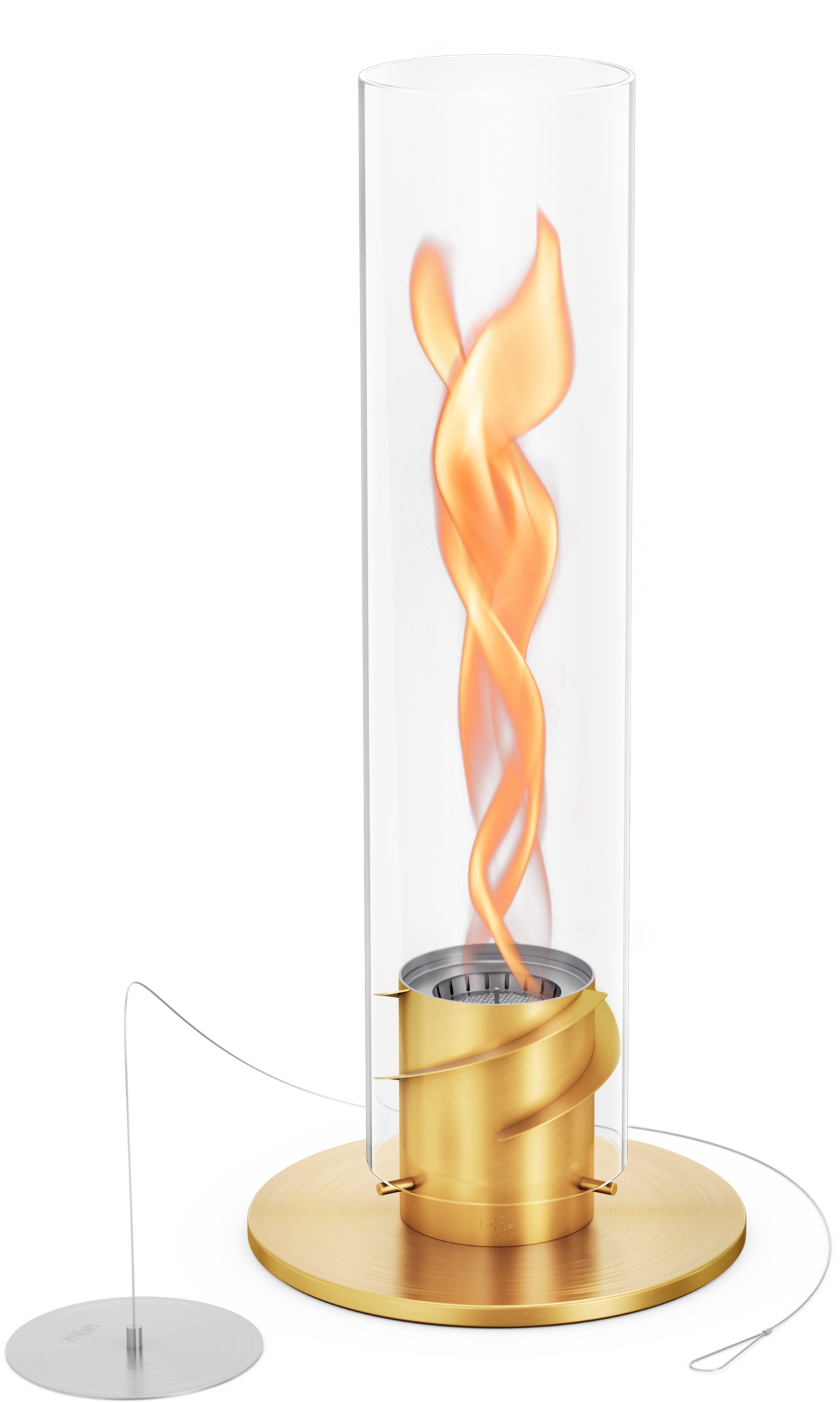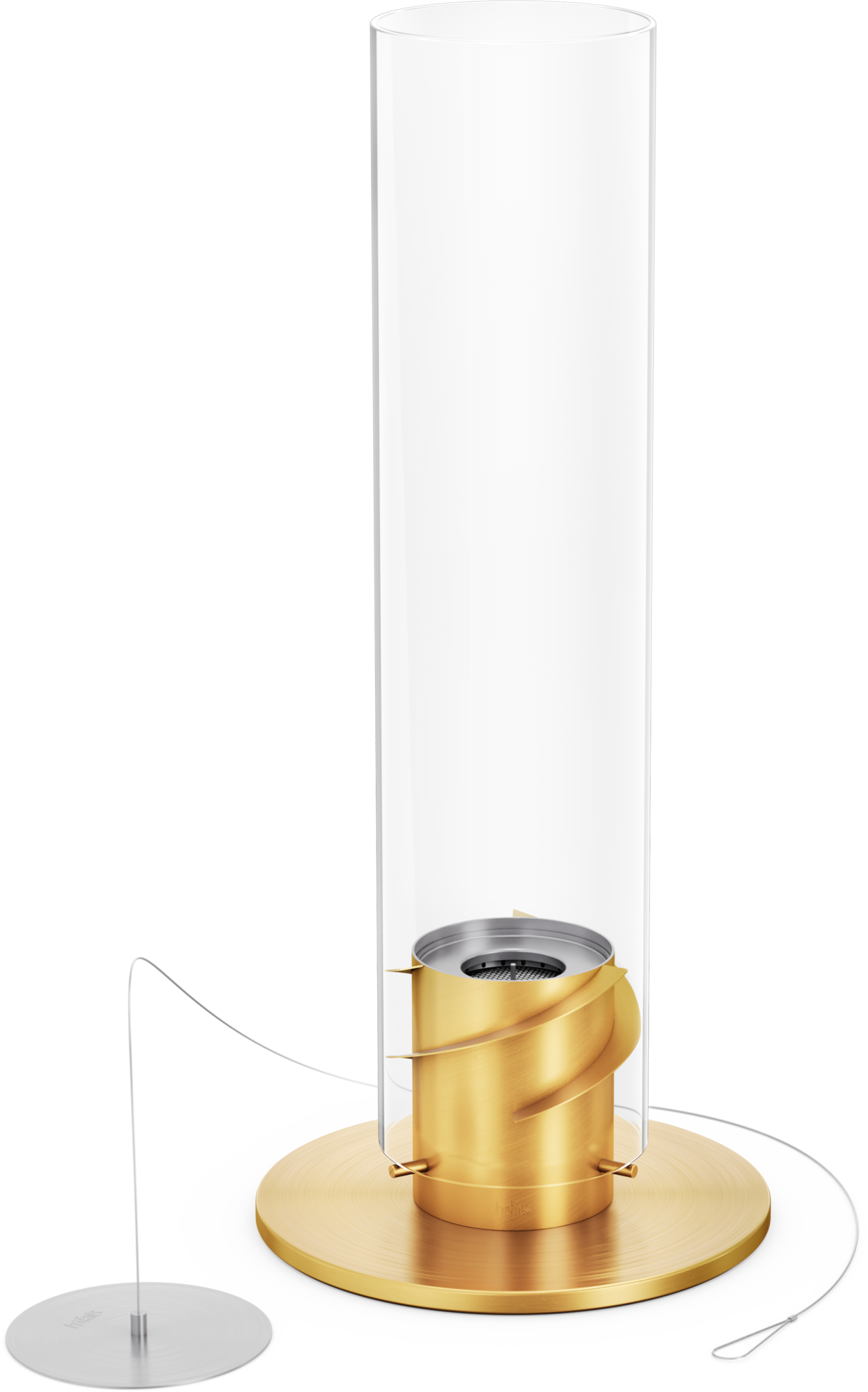 Zodra de vloeibare brandstof is aangestoken en de glazen cilinder is geplaatst, wordt de aanstromende lucht via drie schoepen in een draaiende beweging gebracht. Zo ontstaat een unieke thermiek die – in combinatie met het schouweffect van het glas – een veilig omsloten vlamwerveling genereert. Het resultaat: de vlam wordt meer dan 500% hoger en vult de hele glazen cilinder, zonder extra energieverbruik.