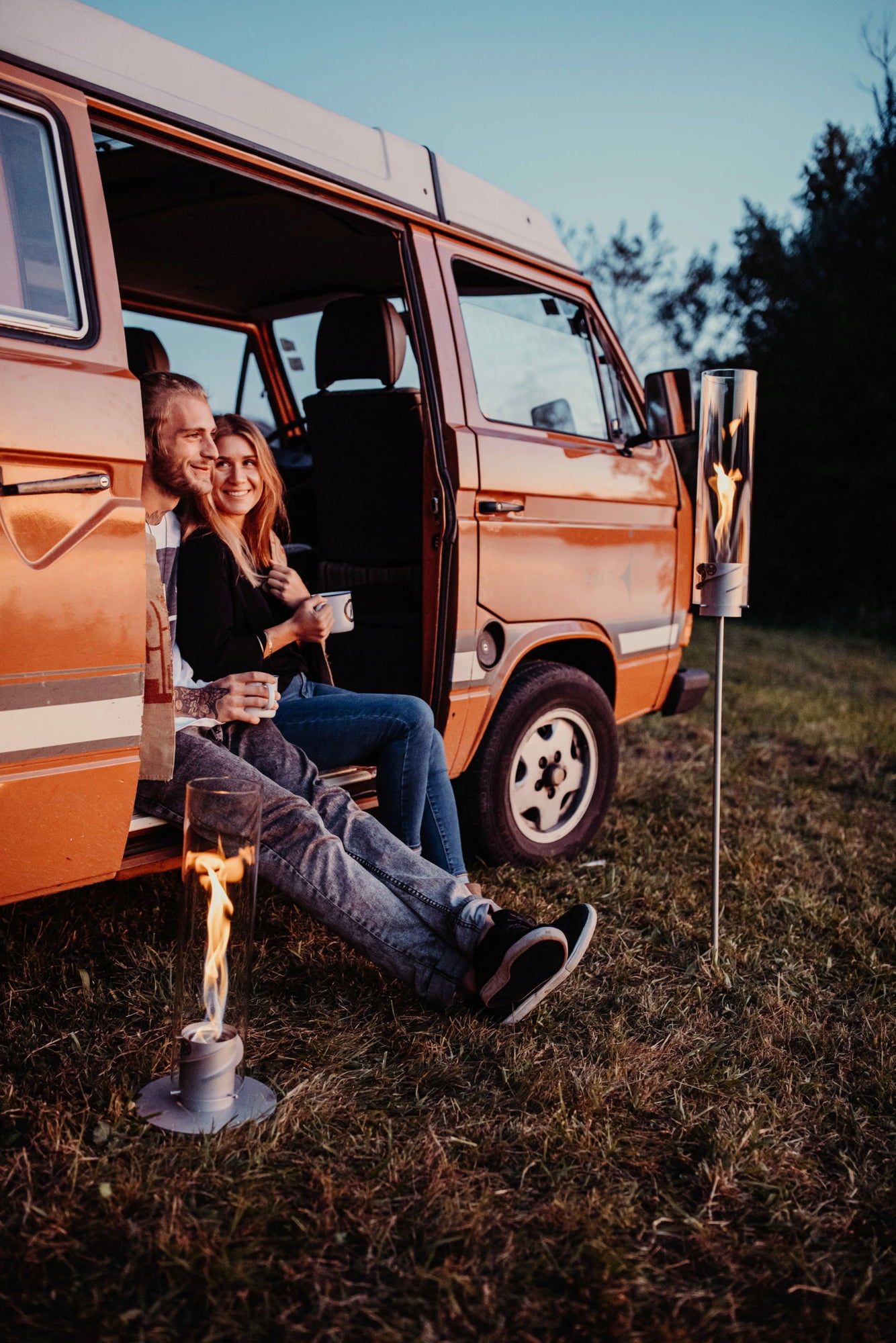 Hij is heel eenvoudig aan te steken: steek de fakkel in de grond, steek het bio-ethanol blikje in de basis, steek het aan en plaats de glazen cilinder erop. De vlam draait rond en creëert een gezellige sfeer tot 60 minuten lang.
