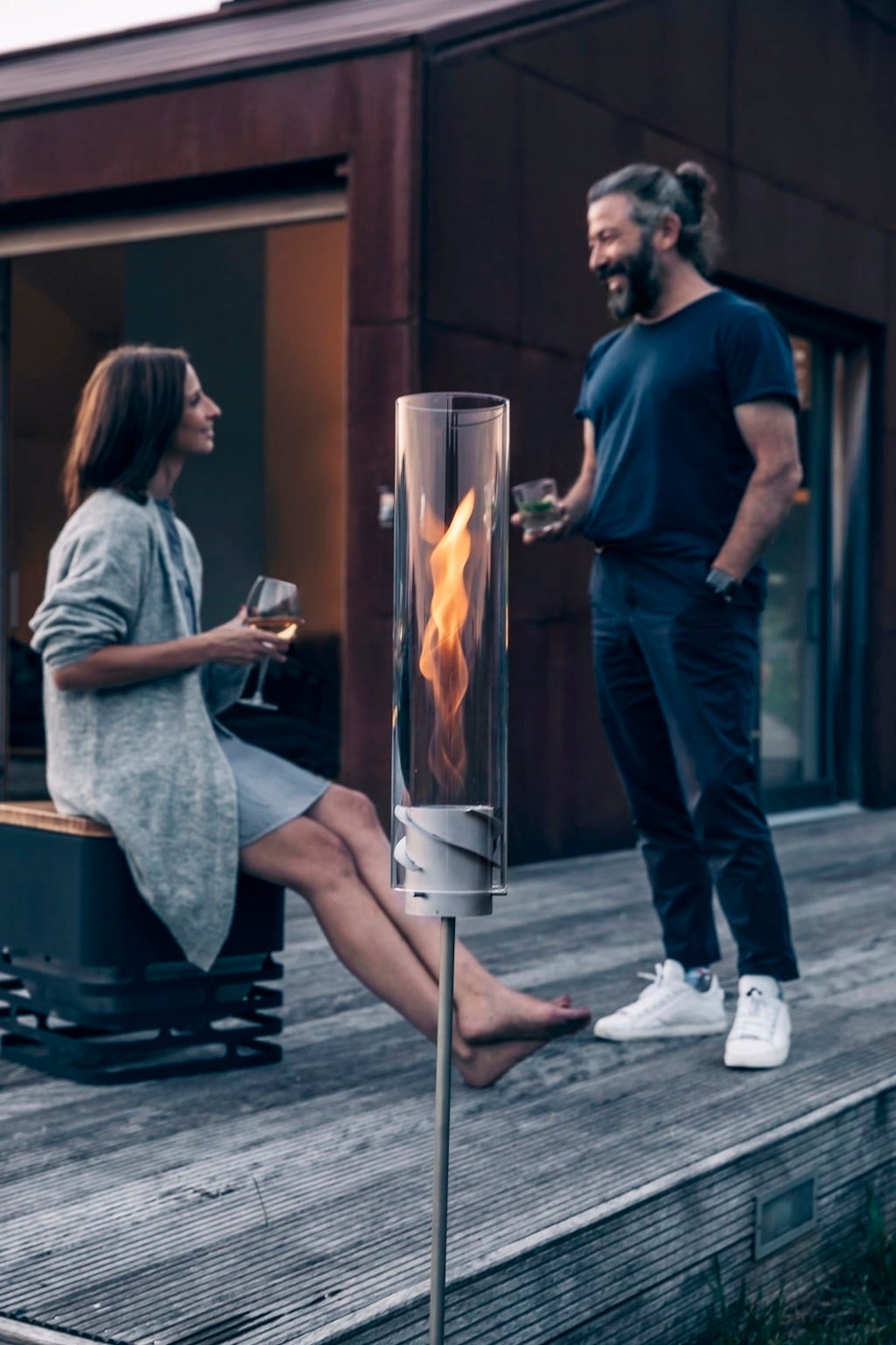 De SPIN tuinfakkel in tijdloos zilver creëert een sfeervolle ambiance met zijn fascinerende vlammenspel. Het bekroonde ontwerp, de hoogwaardige afwerking en het veilige en gemakkelijke stoken met bio-ethanol maken het een must-have voor elk tuinfeest.