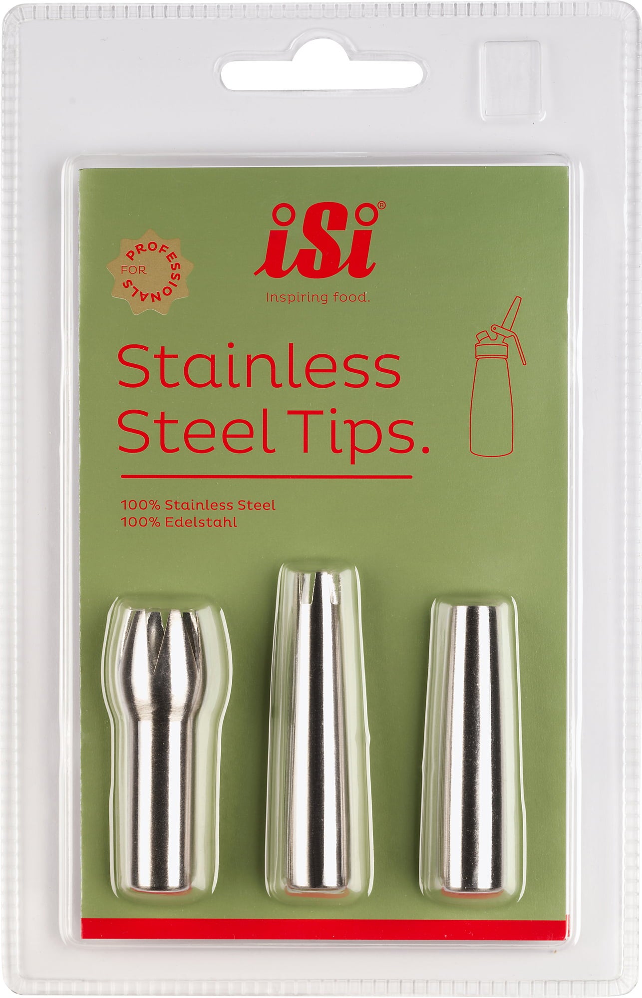 De iSi roestvrijstalen mondstukken zijn ideaal voor het presenteren van crèmes, desserts, sauzen, soepen en meer als een echte chef-kok. De mondstukken zijn gemaakt van 100% roestvrij staal, is duurzaam en vaatwasmachinebestendig.