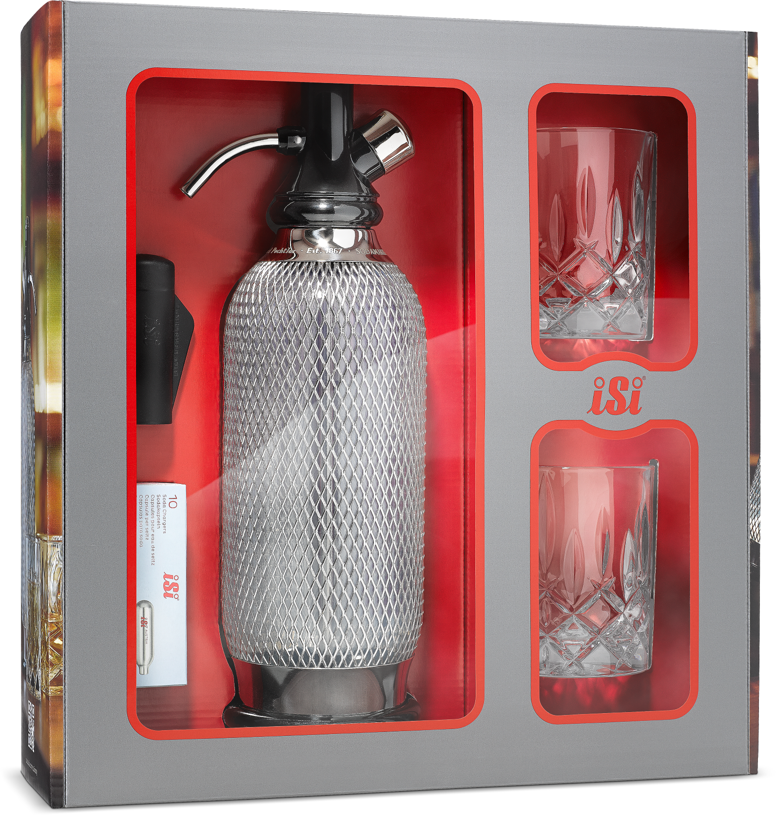 Omvang levering: iSi Sodamaker Classic, 2 x Nachtmann Noblesse whiskyglazen, receptenboekje met 4 cocktailrecepten, 10 x iSi sodacapsules