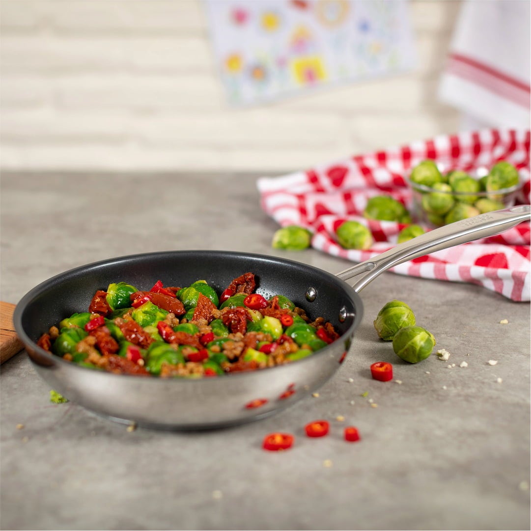 Deze allround koekenpan van robuust roestvrij staal is geschikt voor alle soorten kookplaten, inclusief inductie, en heeft ook een drielaagse anti-aanbaklaag met titaniumdeeltjes van hoge kwaliteit, waardoor je met minder vet hoeft te bakken zonder het eten aan te branden. Hij kan zelfs in de oven gebruikt worden tot 240°C, waardoor dit het perfecte kookgerei is voor alle gelegenheden!