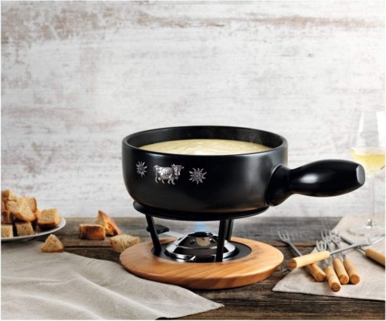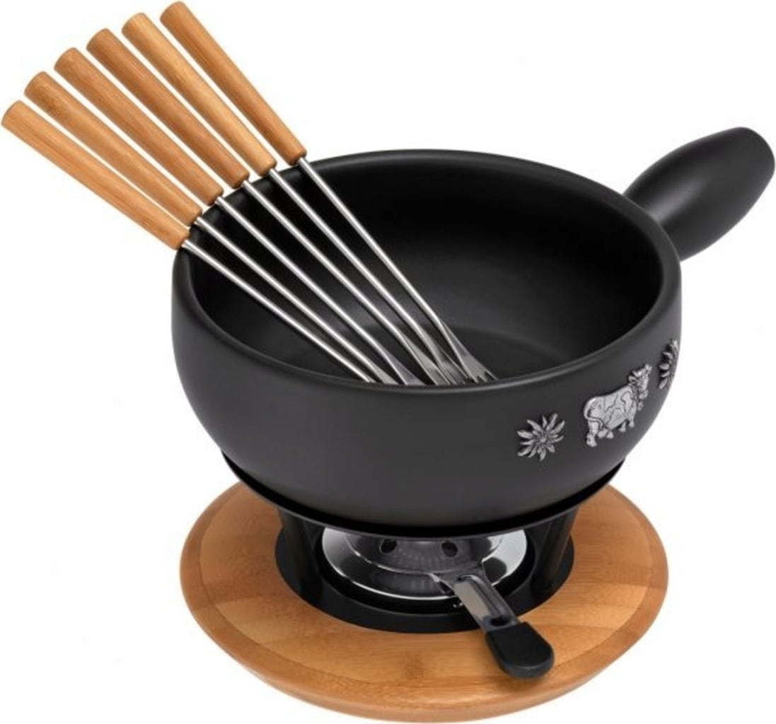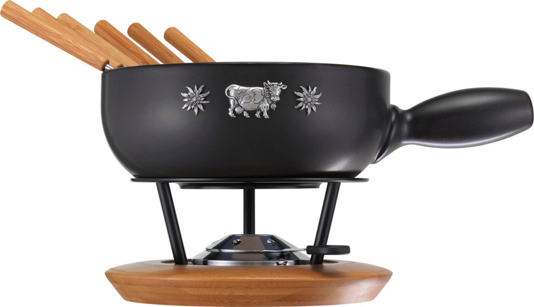 Deze elegante, zwart geglazuurde caquelon met zilverkleurige roestvrijstalen applicaties maakt van elke fondue een feestelijk feest. De fijn geselecteerde decoratieve applicaties met een koe- en edelweissmotief passen hier perfect bij.