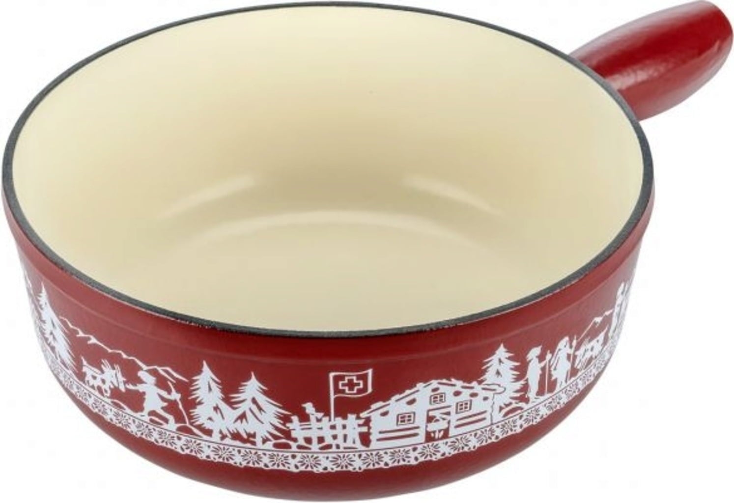 De "Alpweide" caquelon van gietijzer, met zijn karakteristieke rode glazuur en witte silhouetprint, maakt indruk met zijn uitstekende design en zijn optimale warmtegeleiding en warmtebehoud.