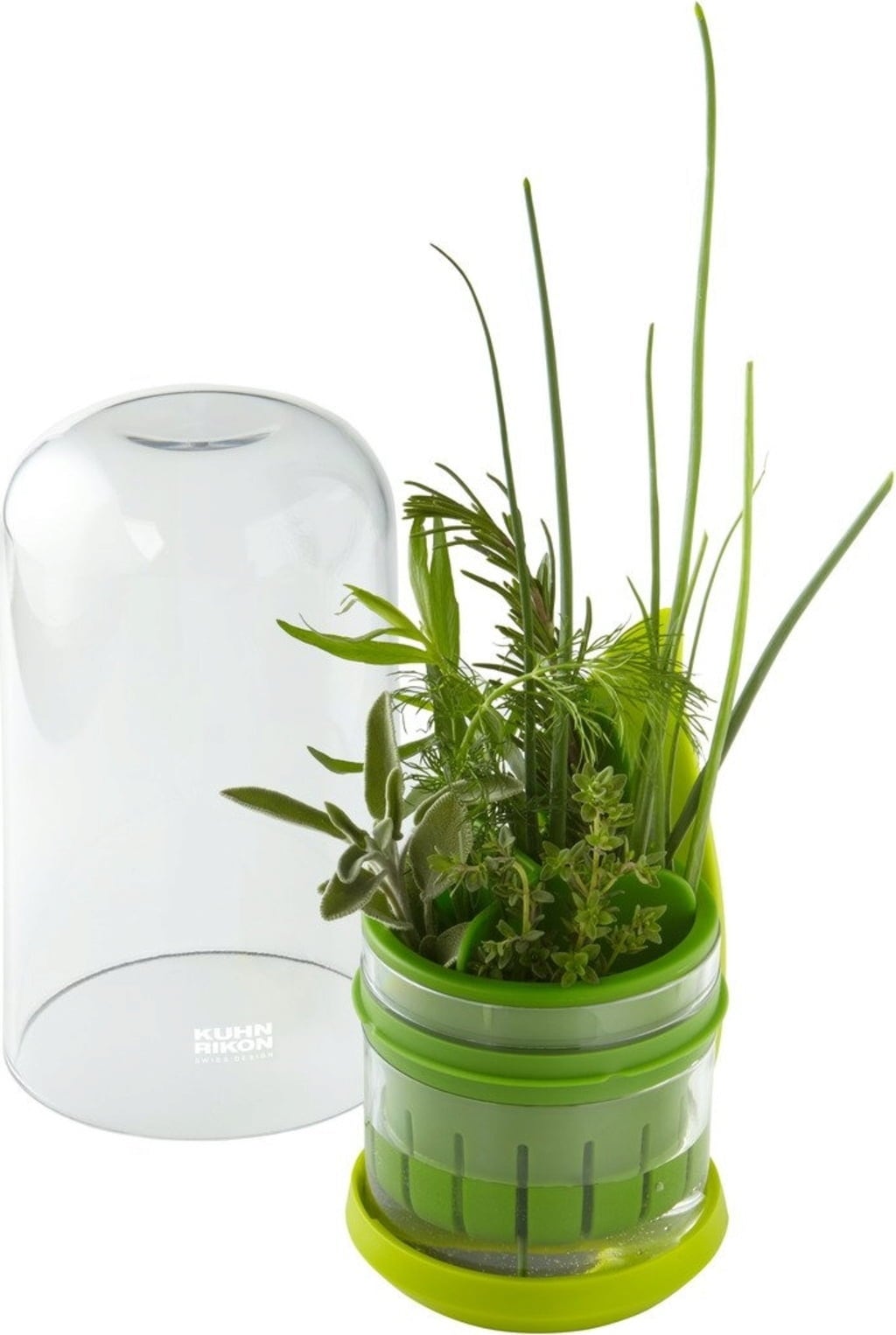 De kruidenpot binnenin heeft een bladvormig handvat om snel bij de kruiden te kunnen en het waterreservoir te vullen.
