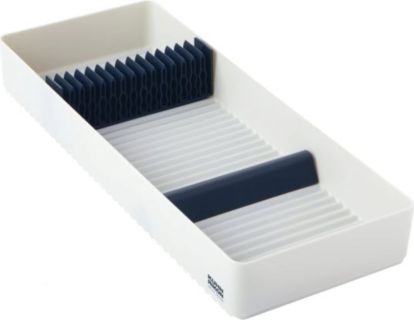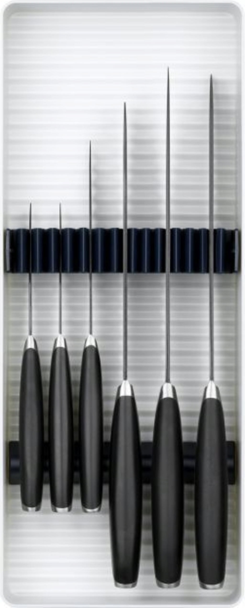 De doorzichtige inzet voor lades is ideaal om keukenmessen perfect te organiseren en er gemakkelijk uit te halen. Dankzij de verplaatsbare inzetstukken kan het worden aangepast aan de grootte van de messen. Het is ook goed te combineren met andere lade-inzetstukken uit de "Wave"-reeks.