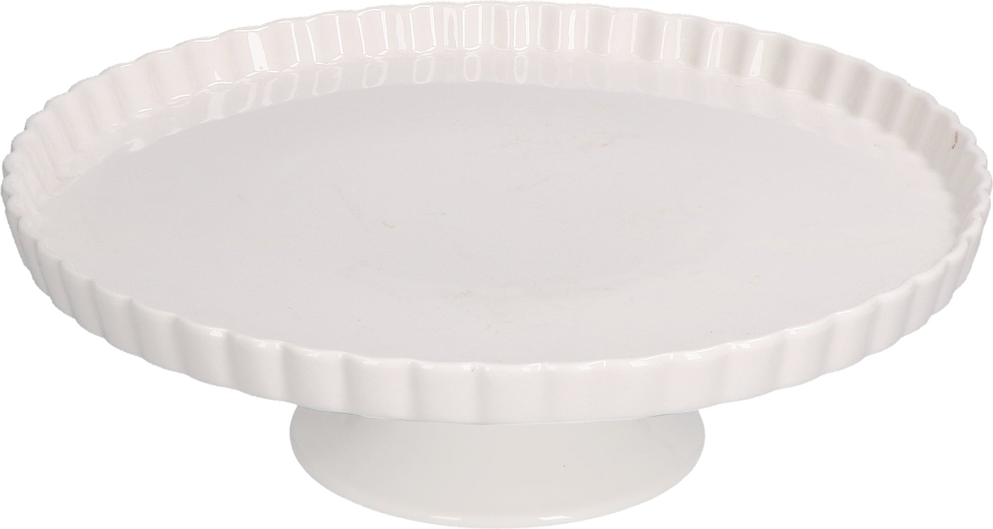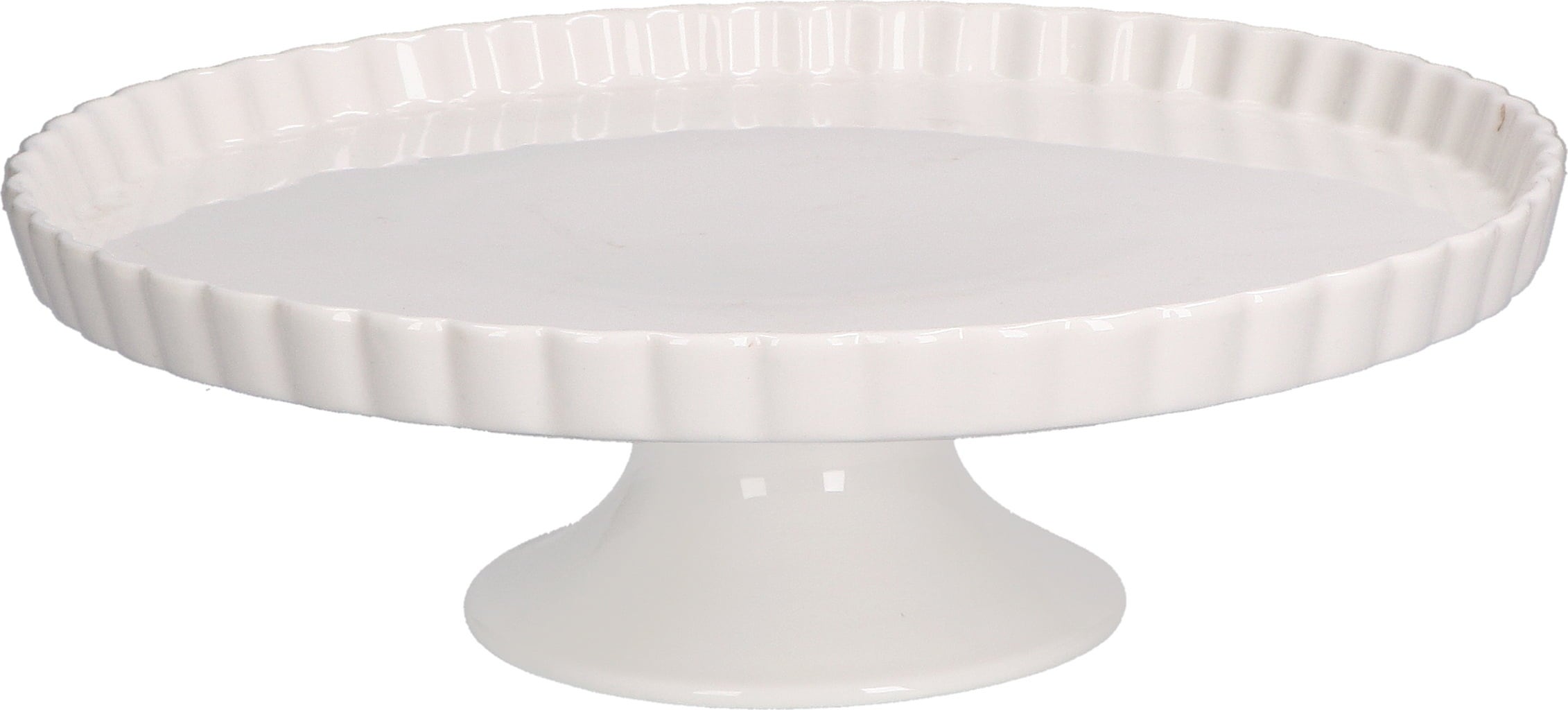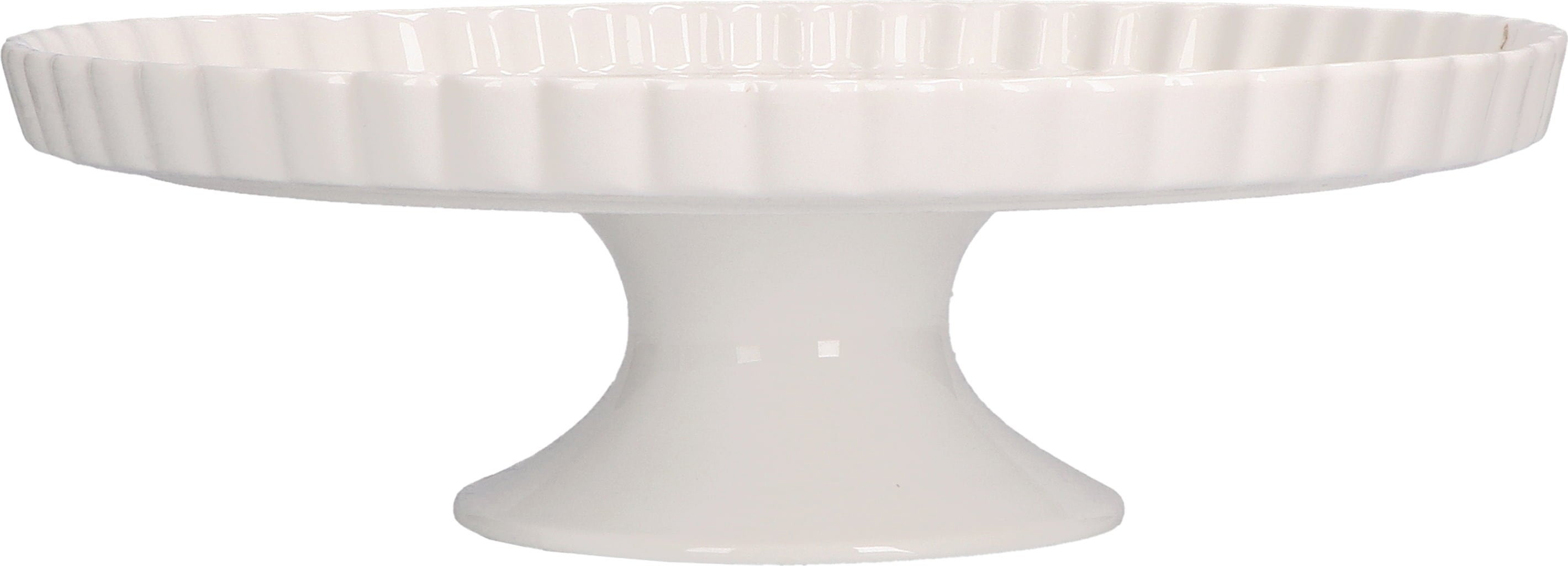 Het is gemaakt van fijn bewerkt keramiek, waarbij de randen een verfijnde geribbelde strucuur hebben die het elegante ontwerp compleet maakt. Verberg je bakkunsten niet onder een korenmaat, maar juist op een chique sokkel en verwen je dierbaren met heerlijke gebakjes!