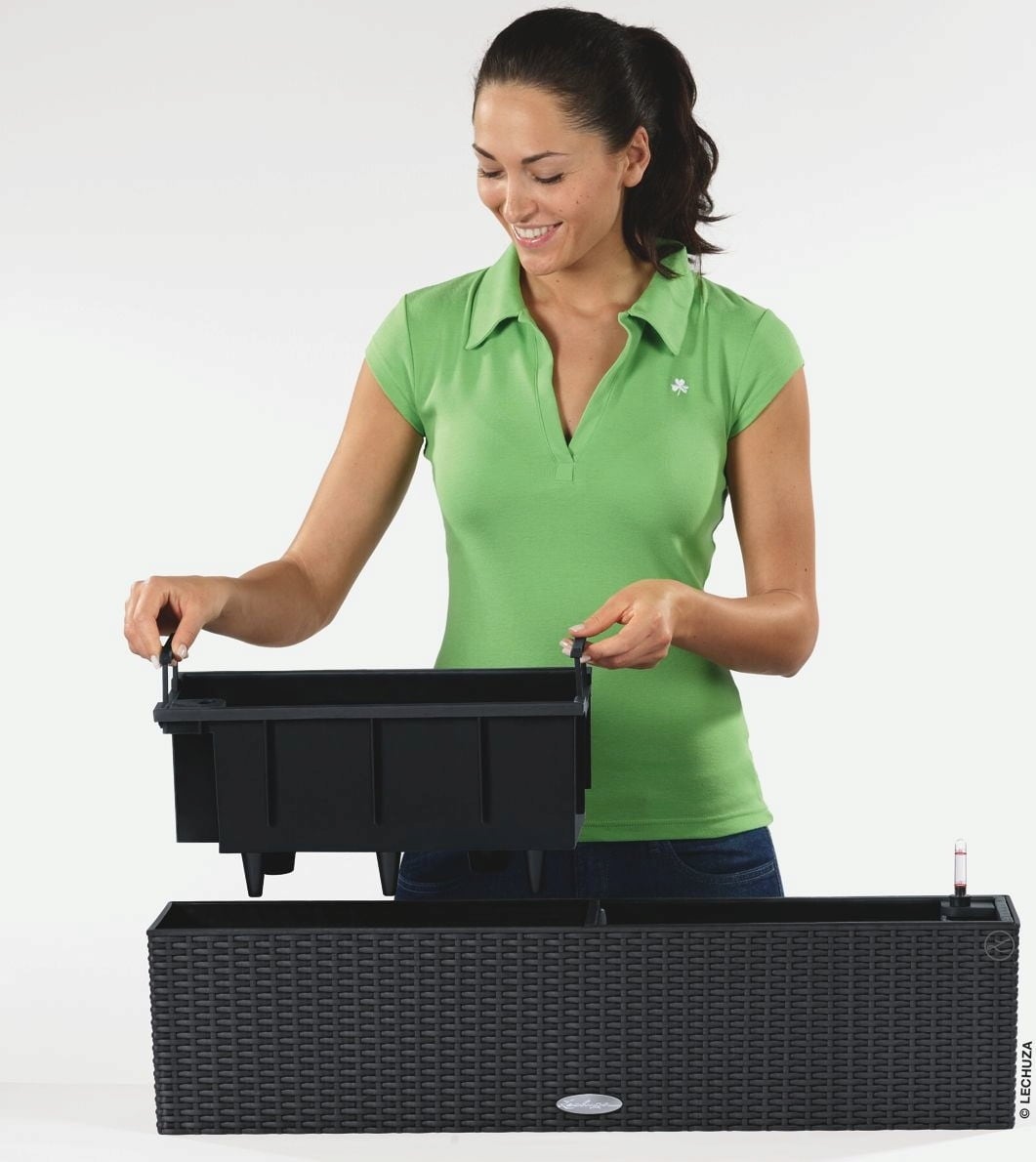 De "Balconera Cottage" plantenbak, geïnspireerd op de romantische landhuisstijl, biedt veel ruimte voor een kleurrijke bloemenpracht. Het ingenieuze "alles-in-één" systeem met twee verwijderbare plantenbakken en het intelligente bodembewateringssysteem van Lechuza maken de plantenbak tot de absolute favoriet van het balkonseizoen. Vrijstaand geplaatst of bevestigd aan de balkonreling met de apart verkrijgbare beugel - de plantenbak van UV-bestendig polypropyleen is altijd een stijlvolle blikvanger.