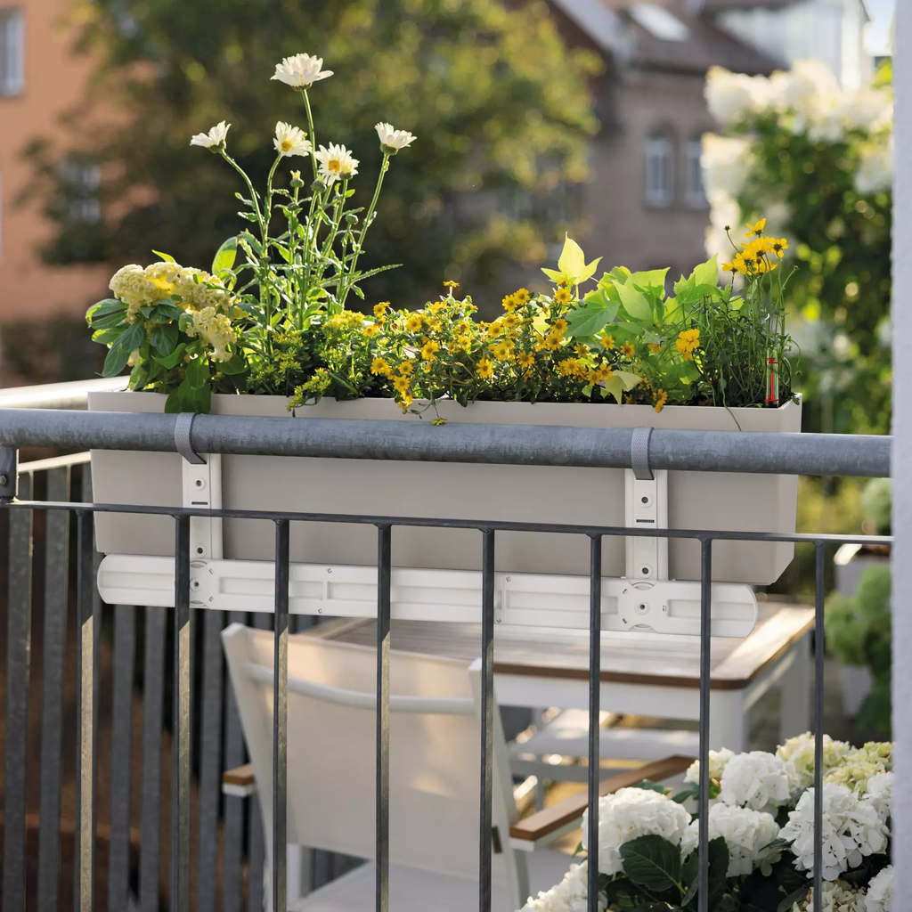 Met het praktische verlengstuk voor de balkonbakhouder kun je je BALCONERA plantenbakken in de maten 40 en 50 eenvoudig bevestigen aan balkonrelingen met een grote afstand tussen de sporten. Dit praktische verlengstuk biedt de plantenbak een stevige houvast en zorgt ervoor dat bloemen, kruiden of grassen stabiel en veilig kunnen groeien - zelfs aan balustrades met een grote tussenruimte.