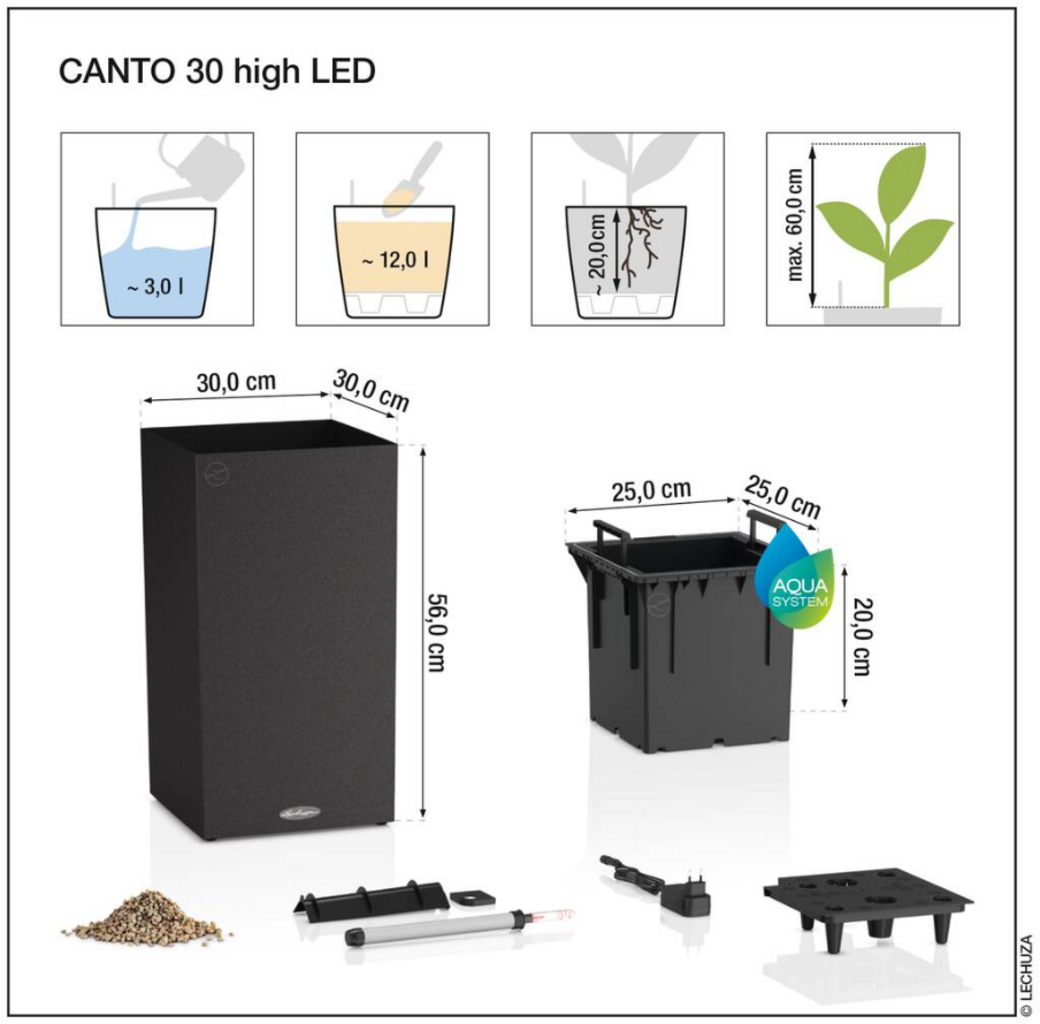 Een slim geïntegreerde LED-lichtstrip verlicht de planten van onderaf en creëert een fascinerende sfeer - of het nu op het terras, balkon of in de woonkamer is. Het LECHUZA bewateringssysteem en de uitneembare planteninzet zorgen voor extra gemak.