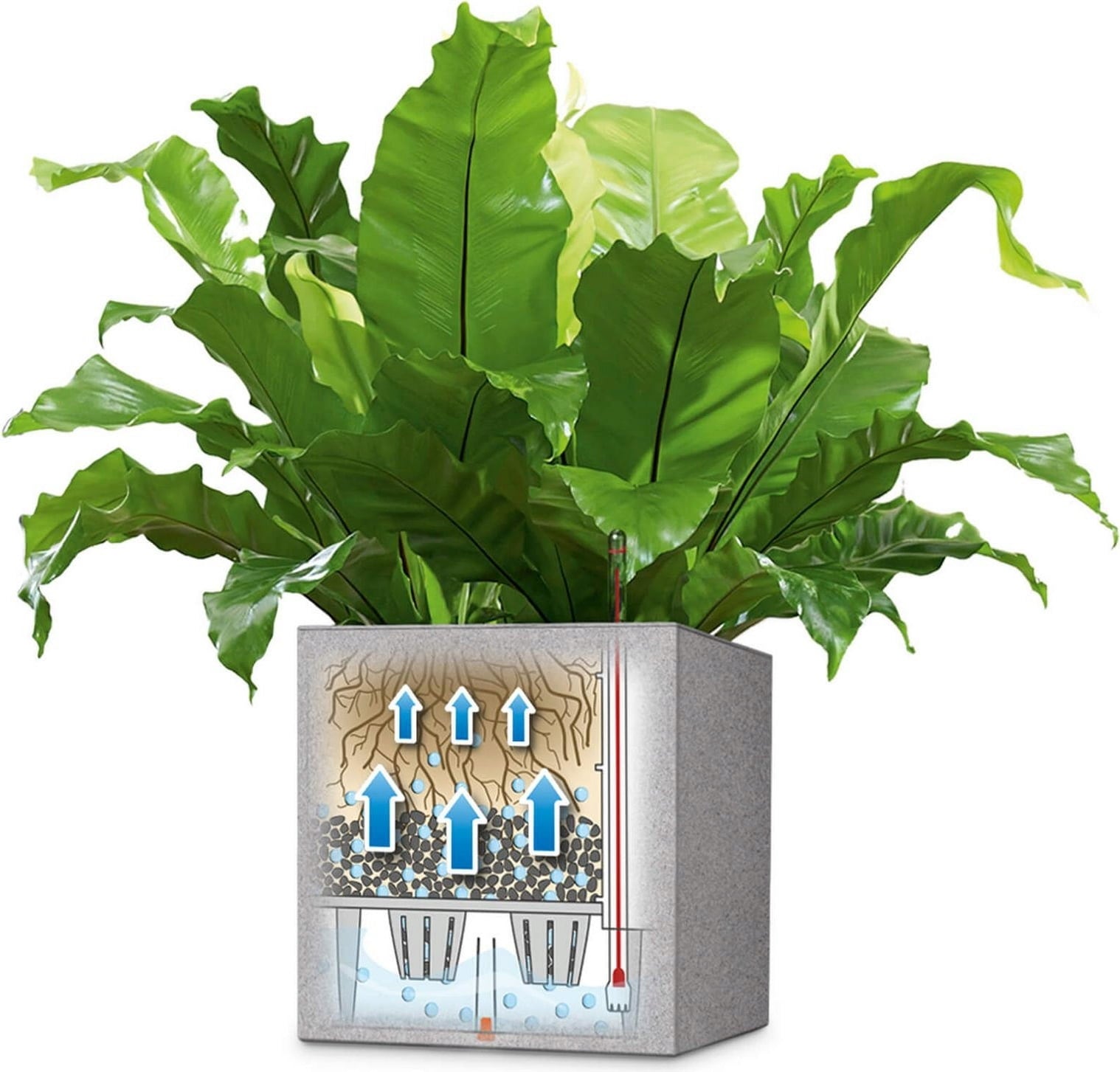 CANTO Stone van Lechuza is precies wat je nodig hebt als je van strakke lijnen houdt. De plantenbak heeft een ruwe natuurstenen look, die een mooi contrast vormt met het weelderige groen en de kleurrijke bloemen.