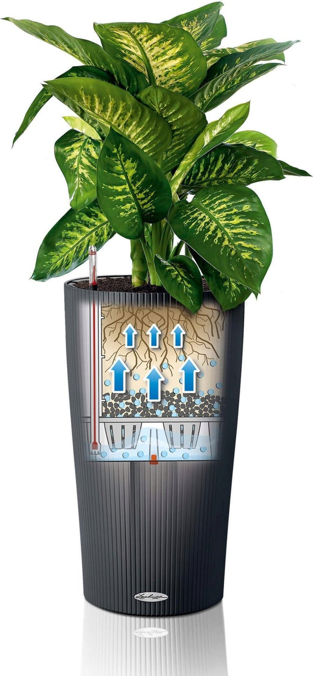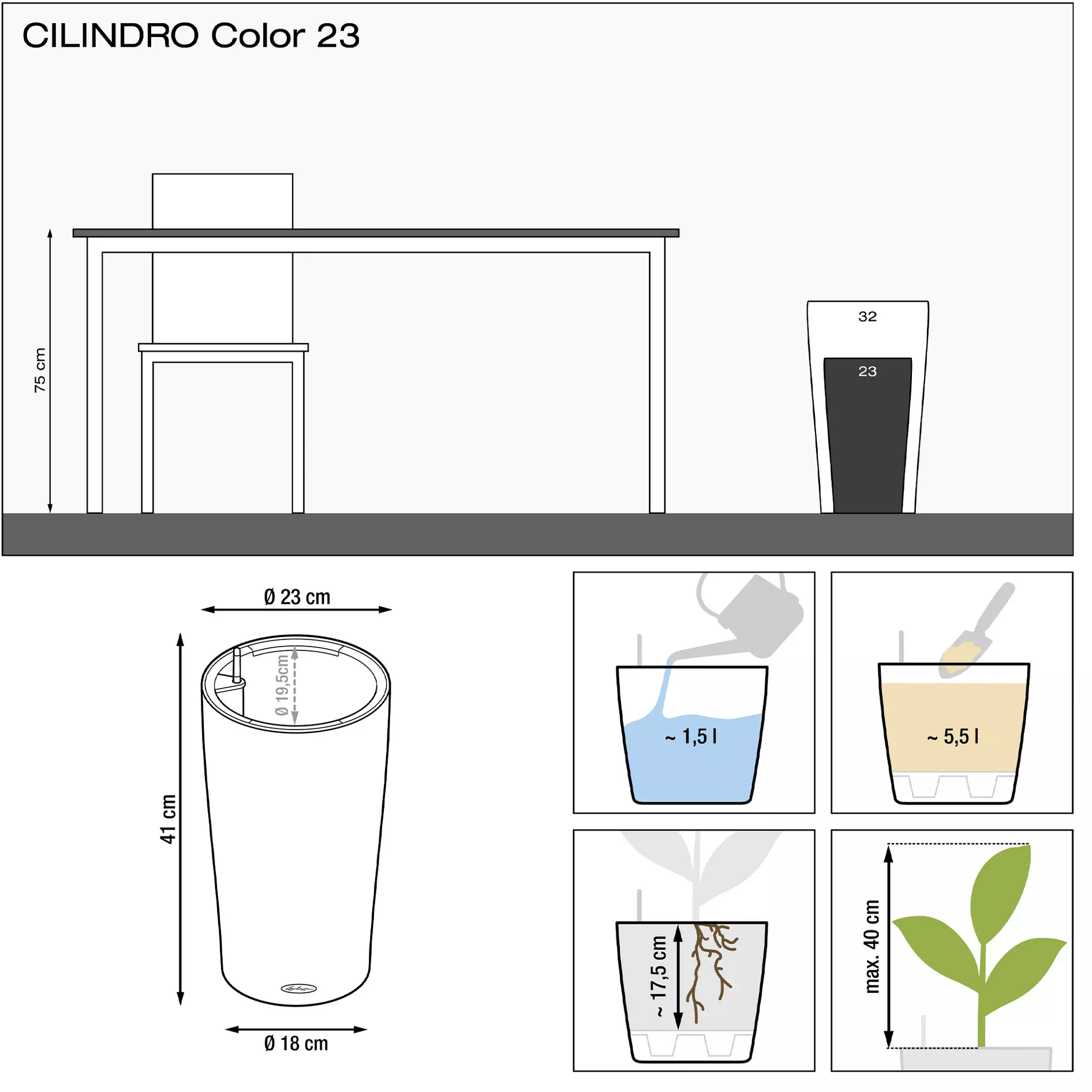 Cilindro wordt geleverd als een alles-in-één set met plantenbak, binnenpot, waterniveau-indicator en plantsubstraat.
