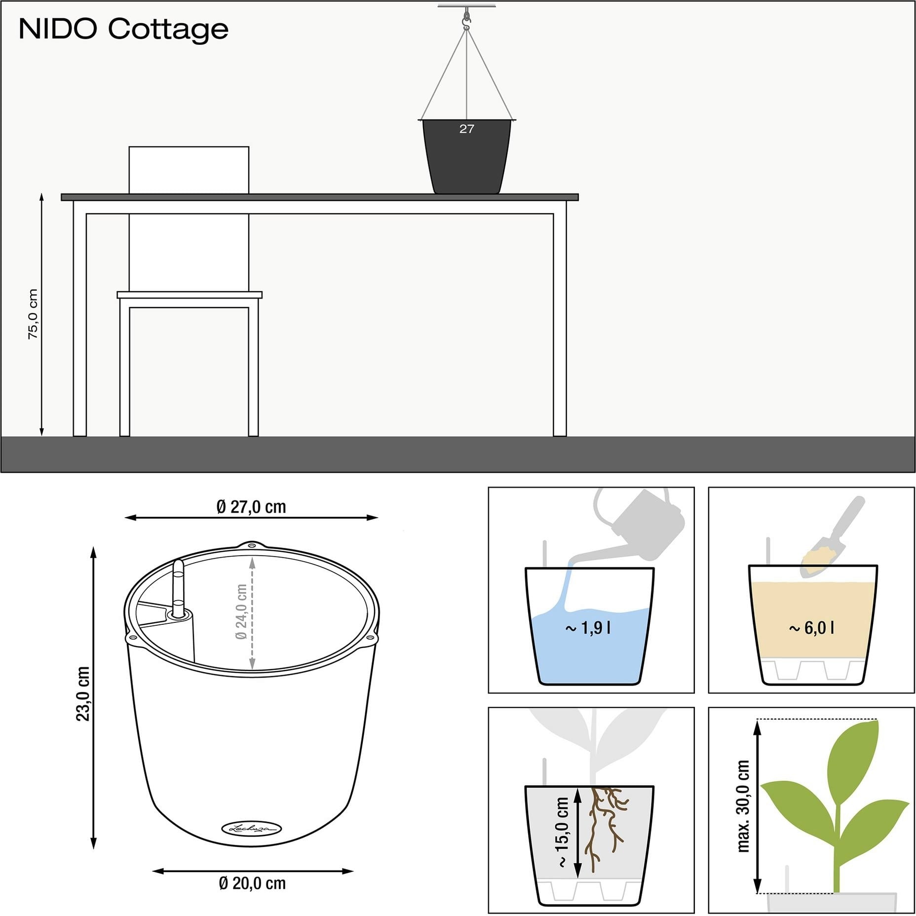 • Plantinzet: Ø 24 cm, plantdiepte: 15 cm, planthoogte: max. 30 cm