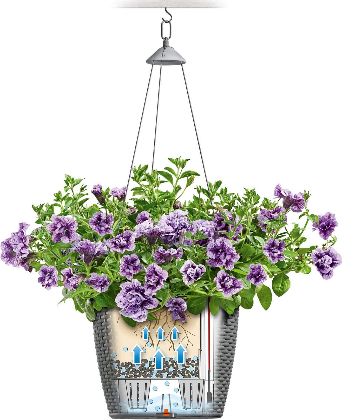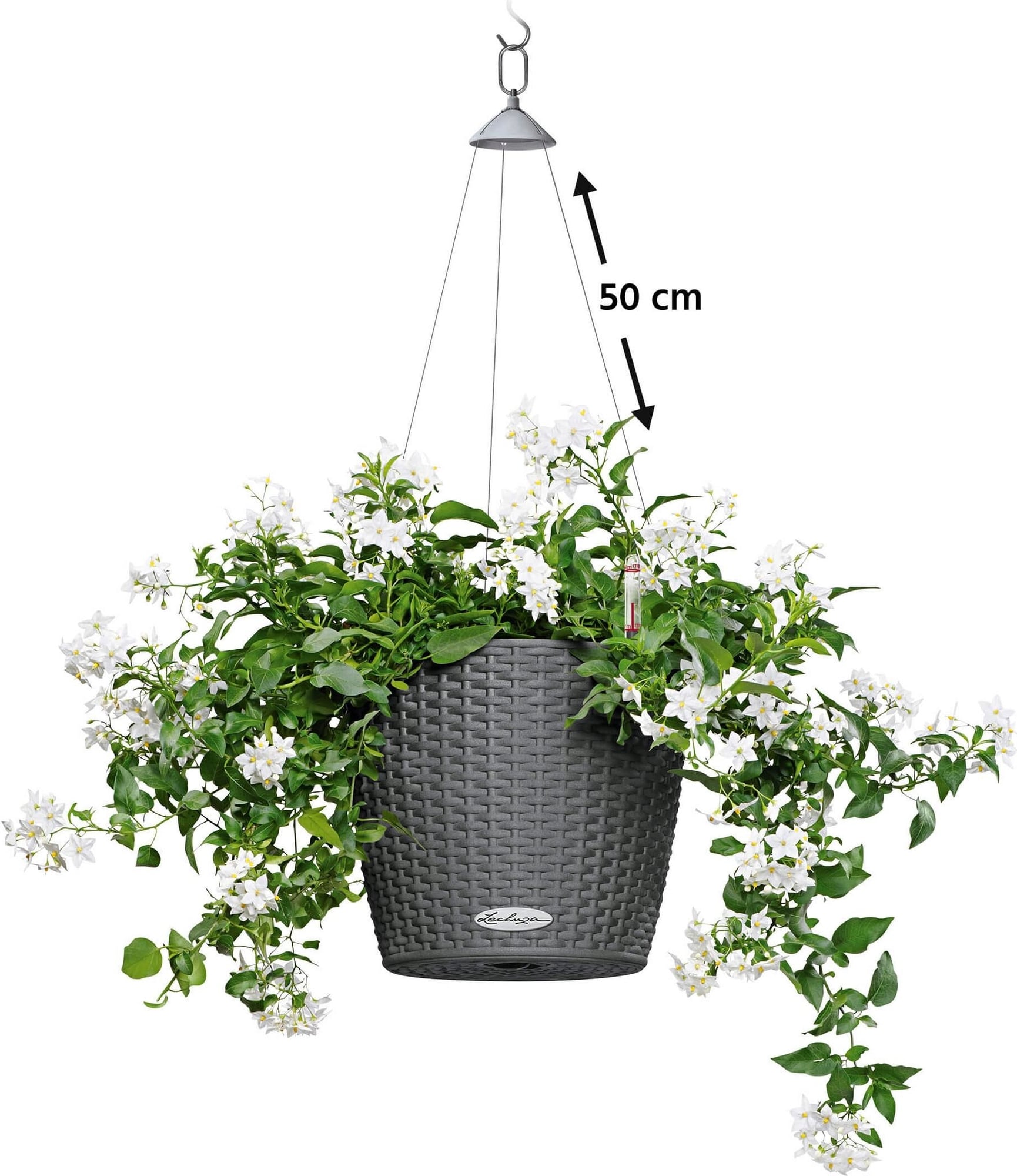 De meegeleverde roestvrijstalen ophanging draagt je bloemen bijzonder veilig.