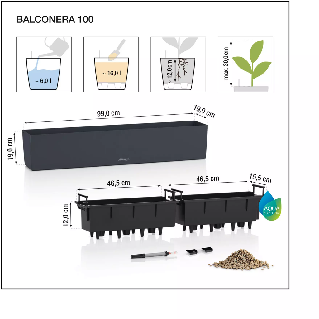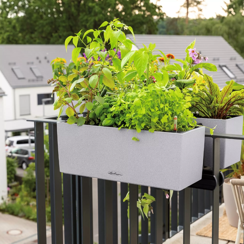 De puristische plantenbak "Balconera Stone" van Lechuza accentueert bloemen vakkundig met zijn aantrekkelijke oppervlaktestructuur. Bovendien overtuigt hij bijzonder door zijn praktische eigenschappen, die het hart van elke tuinier sneller doen kloppen. Vrijstaand geplaatst of met de apart verkrijgbare beugel aan de balkonreling bevestigd: de plantenbak van UV-bestendig polypropyleen is altijd een stijlvolle blikvanger.