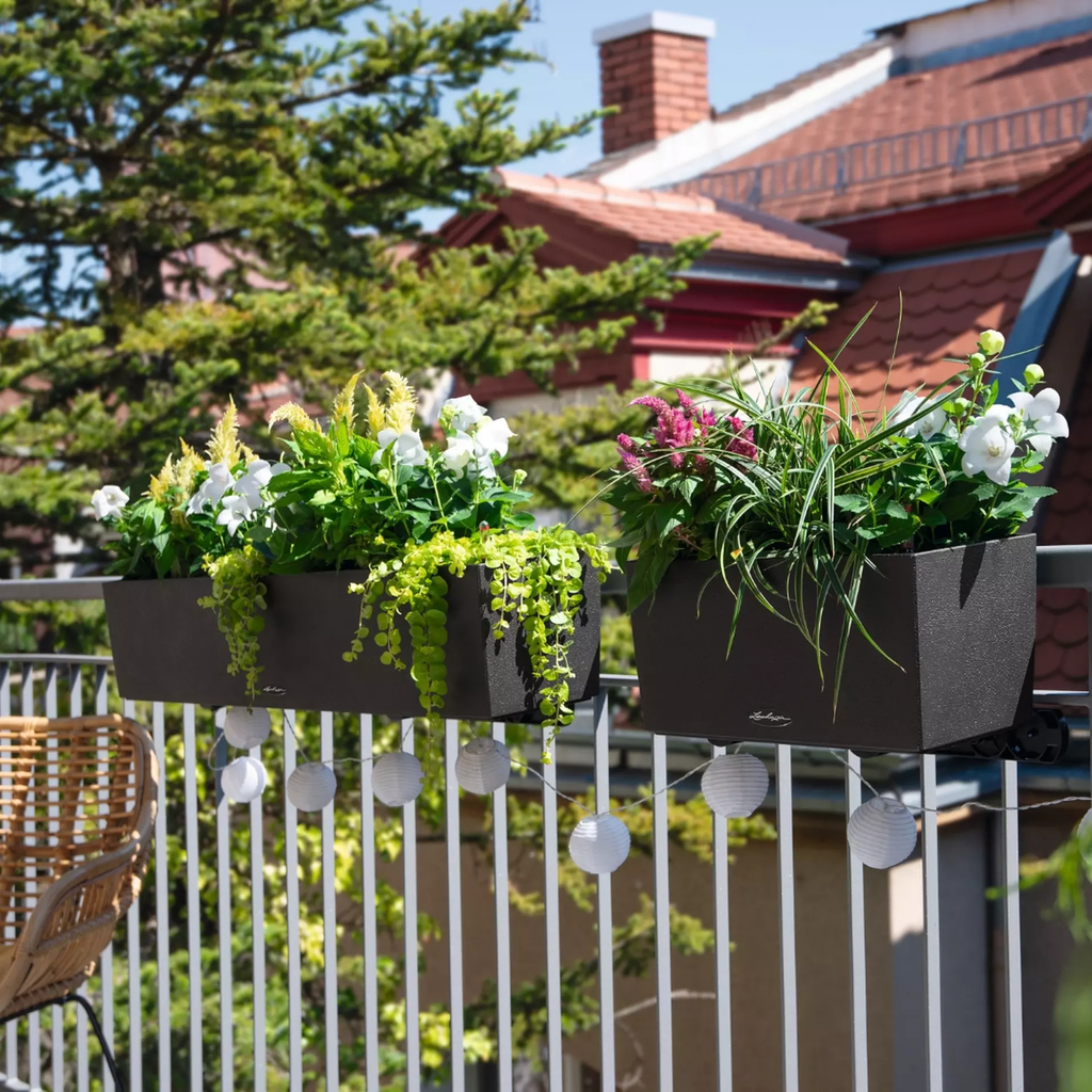 De puristische plantenbak "Balconera Stone" van Lechuza accentueert bloemen vakkundig met zijn aantrekkelijke oppervlaktestructuur. Bovendien overtuigt hij bijzonder door zijn praktische eigenschappen, die het hart van elke tuinier sneller doen kloppen. Vrijstaand geplaatst of met de apart verkrijgbare beugel aan de balkonreling bevestigd: de plantenbak van UV-bestendig polypropyleen is altijd een stijlvolle blikvanger.