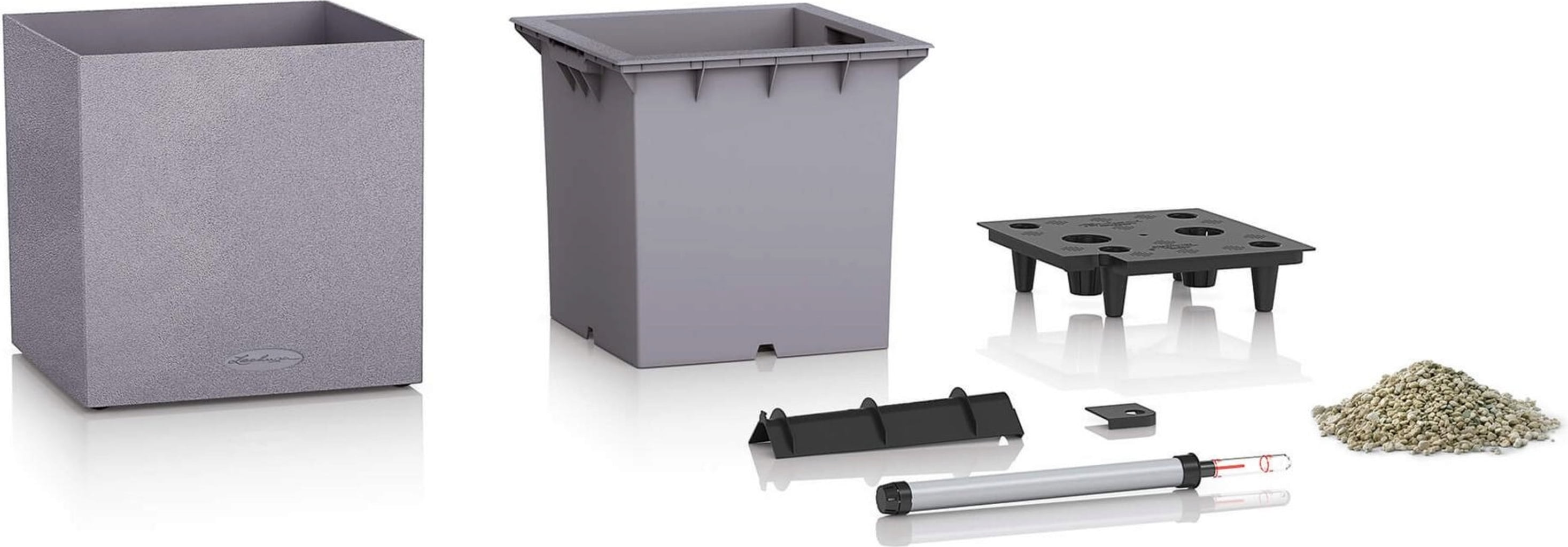 De alles-in-één set bestaat uit: de plantenbak, de plantenbakinzet met frame in de kleur van de pot en verzonken handgrepen en de Lechuza potgrondbewateringsset.