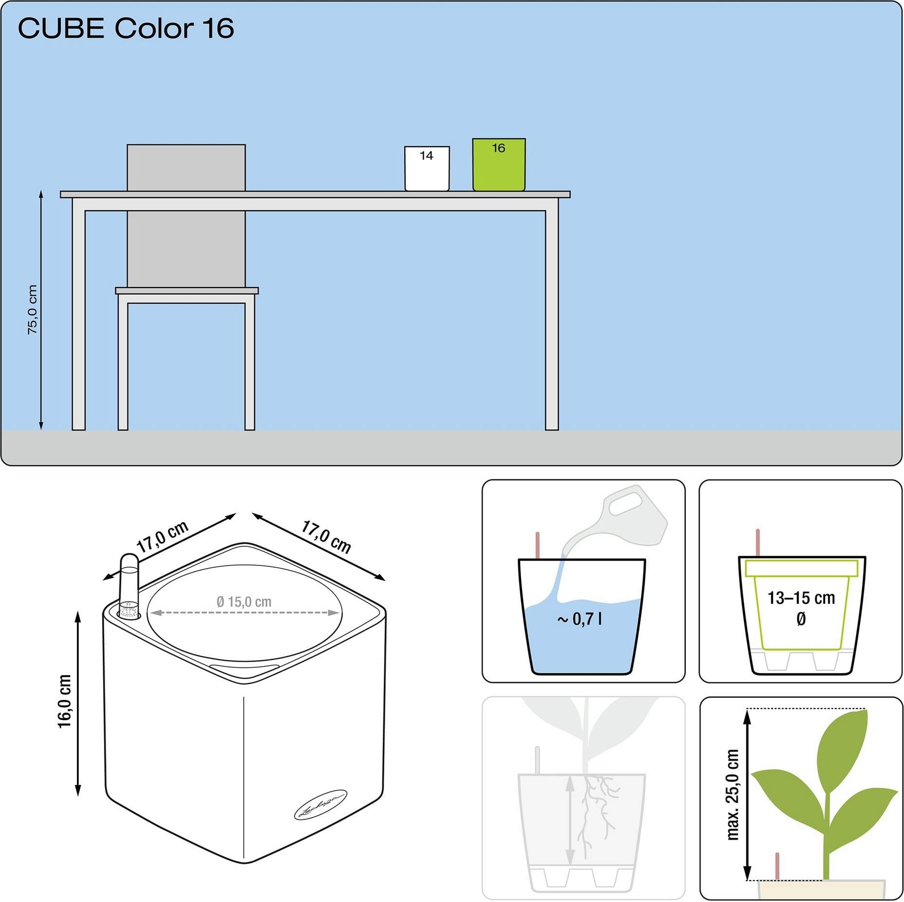 Deze mooie kruidenpot Cube Color 16 van Lechuza is voorzien van een lontirrigatiesysteem. In een kweekpot worden basilicum, bieslook, rozemarijn of eenjarige sierplanten gebruikt, planten is niet meer nodig. Steek gewoon de meegeleverde lont in de bodem van de plantenbak en geef water zoals gewoonlijk. De plant krijgt de benodigde hoeveelheid water.
