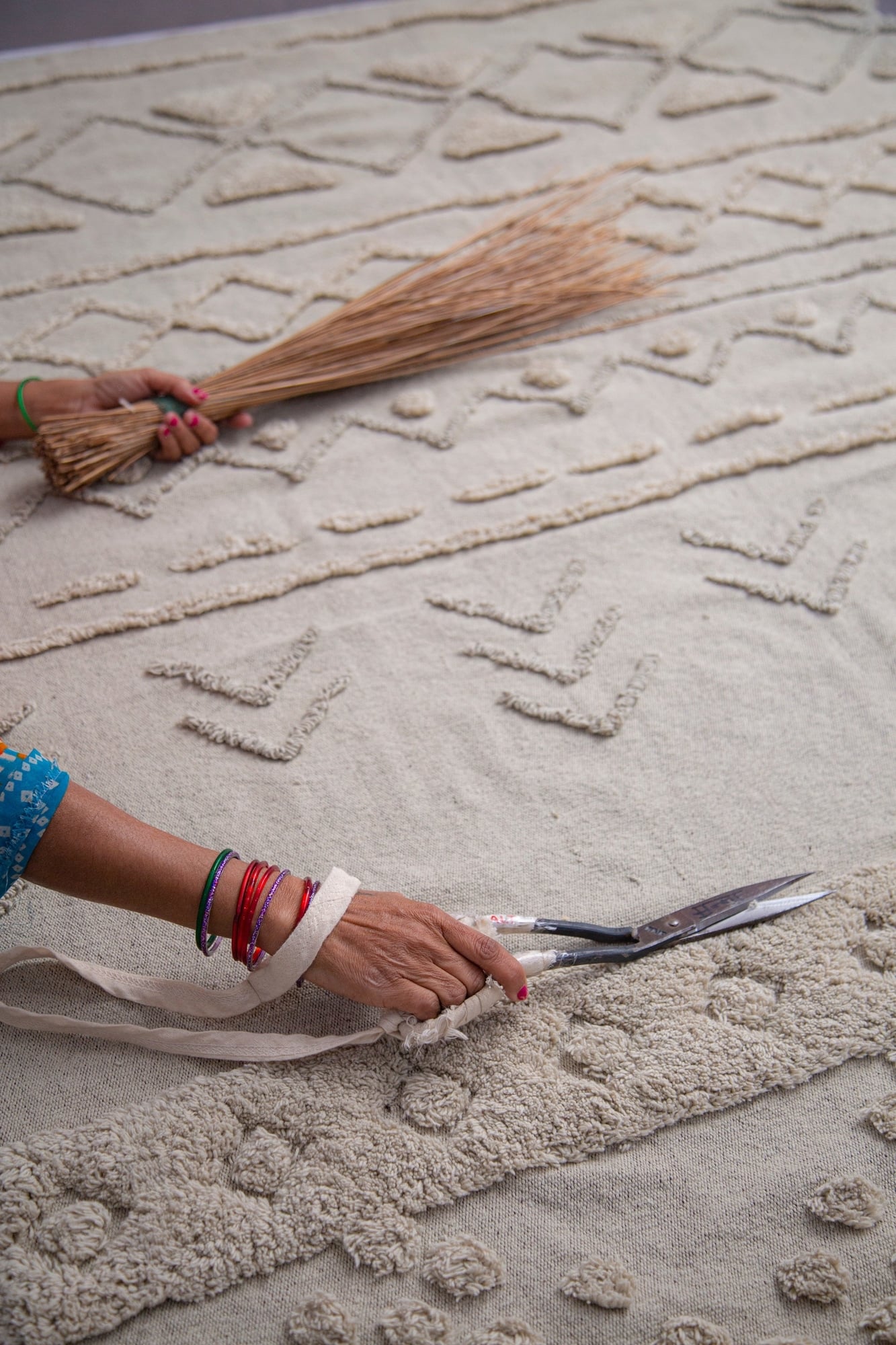 Het Tribu katoenen vloerkleed van Lorena Canals is een geraffineerde compositie van stof, design en fijne textuur. Het ziet er misschien monochroom uit, maar de "Natural" kleur is eigenlijk een mix van de natuurlijke kleur van het garen in het tribale patroon en de mix van bruin en "Natural" aan de basis. Elke hoek is afgewerkt met een kwastje - een kenmerk van klassieke tapijten uit vroegere tijden, vooral uit het Oosten. Voor de basis aan de onderkant is gerecycled katoen gebruikt.