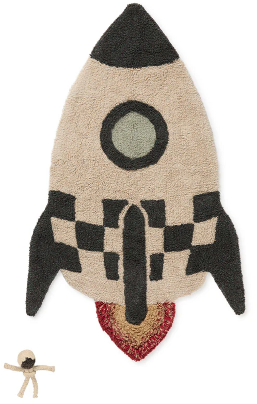 Klaar om op te stijgen? Het wasbare vloerkleed Raket brengt avontuur en verbeelding in de kinderkamer. Het is handgemaakt van natuurlijk katoen en combineert moderne en vintage elementen tot een uniek ontwerp. Een speciaal extraatje: een kleine astronaut vergezelt elk ruimteavontuur!