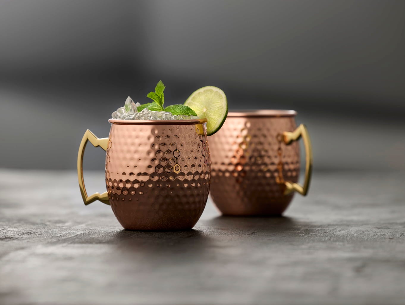 Het heeft een koperen, gehamerde buitenkant en een elegant handvat en dankzij het materiaal blijft de Moscow Mule, die ijskoud wordt gedronken, nog langer koud.