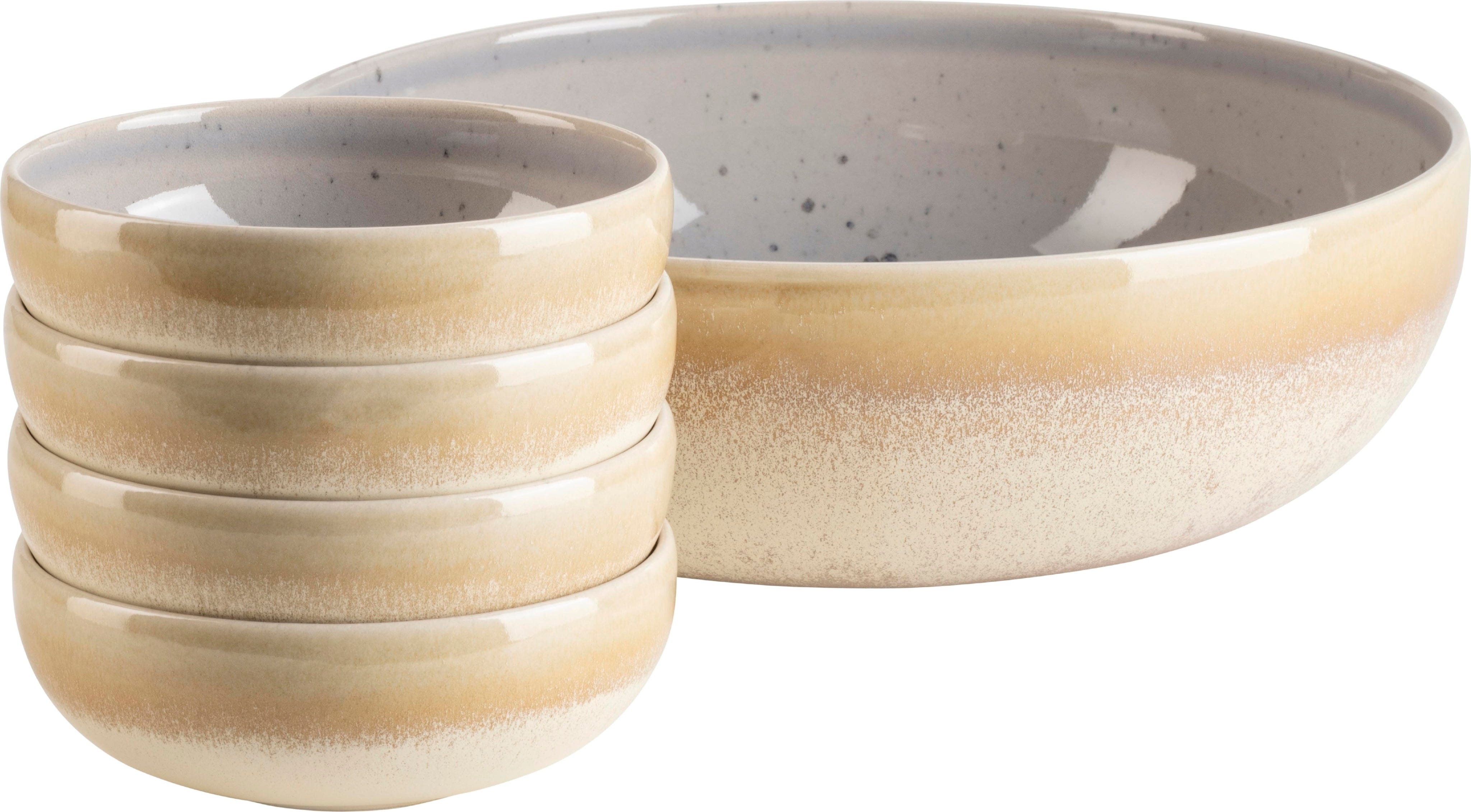 De moderne, ronde vormgeving ligt prettig in de hand en maakt de set tot een veelzijdige allrounder voor elk moment van de dag – van een heerlijk ontbijt tot een gezellige avond met vrienden! De set bevat één grote schaal voor salades of fruit en vier kleinere kommen, ideaal voor het serveren en individueel genieten.