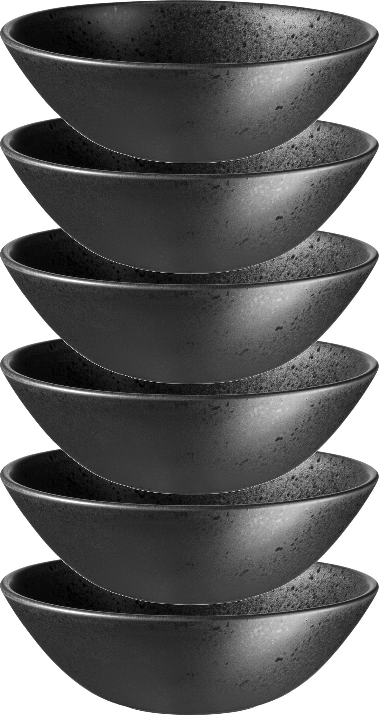 Geef je ontbijttafel of je bowl-creaties in de avond een upgrade met deze zesdelige kommenset van Mäser! Elke kom valt op door de spannende combinatie van een diepzwarte, matte glazuur en subtiele, glanzende spikkels die je gerechten een chique uitstraling geven.