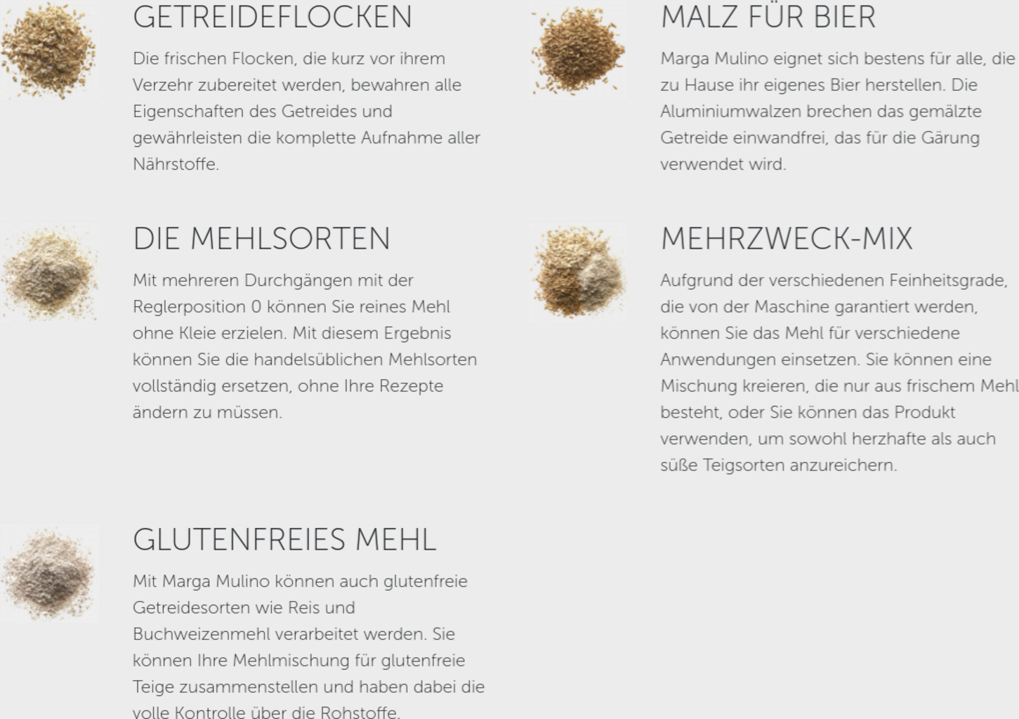 Marga Mulino maalt haver, gerst, rogge, tarwe, durumtarwe, spelt, kamut, rijst en boekweit. De smaak, geur en voedingsstoffen blijven behouden.