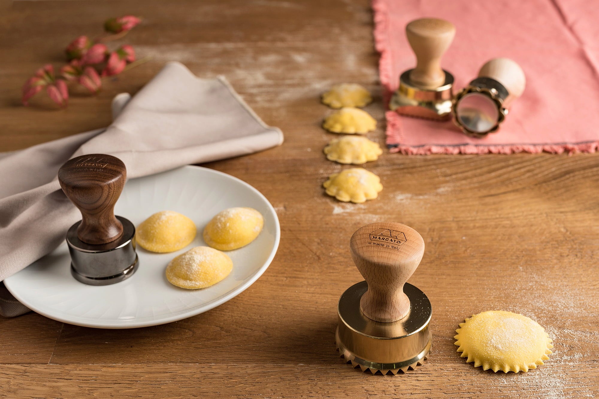 Het maken van perfecte ravioli vergt wat oefening, maar met het juiste gereedschap is het zeker gemakkelijker! De stempels hebben in het midden een veermechanisme, dat de halfbolvormige plaat nauwkeurig op de vulling drukt en tegelijkertijd de randen netjes op elkaar drukt.
