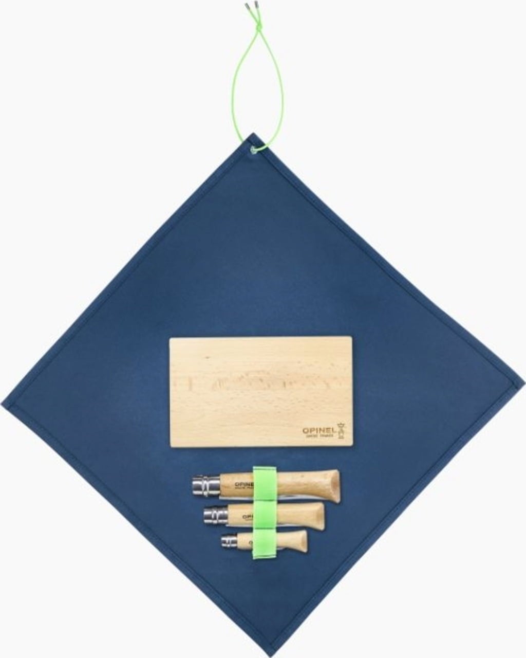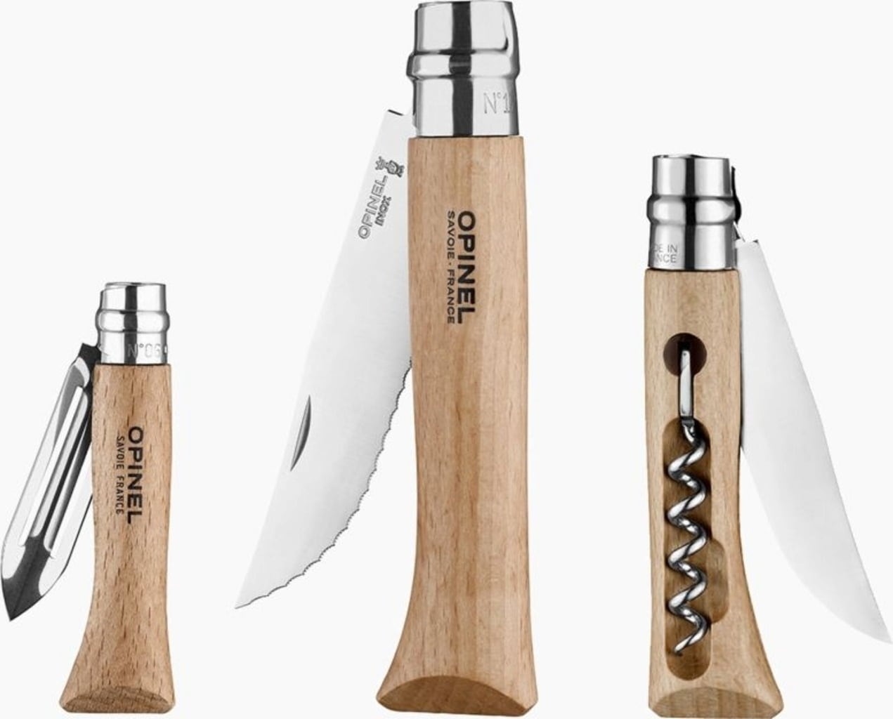 Deze kookset van uitzonderlijke kwaliteit is perfect voor een wandeling, een self-catering vakantie of een picknick. Het Franse bedrijf Opinel vervaardigt de vouwmessen met een speciaal gepatenteerde huls, de Virobloc® veiligheidsring, waarmee het mes bij het openen en sluiten kan worden vergrendeld/vastgezet. Dit systeem in combinatie met het ergonomisch gevormde beukenhouten heft zorgt voor veiligheid.