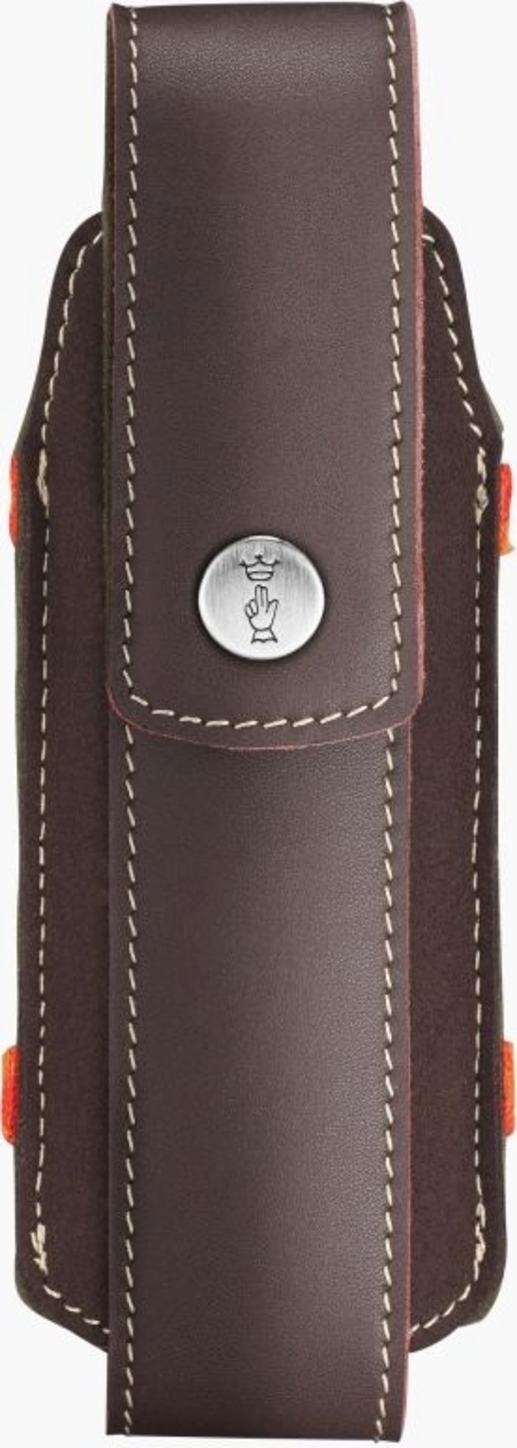 Het handvat is gemaakt van gelakt eikenhout, dat dankzij het hoge tanninegehalte bijzonder goed bestand is tegen insecten en schimmels. Het wordt geleverd in een mooie leren etui.