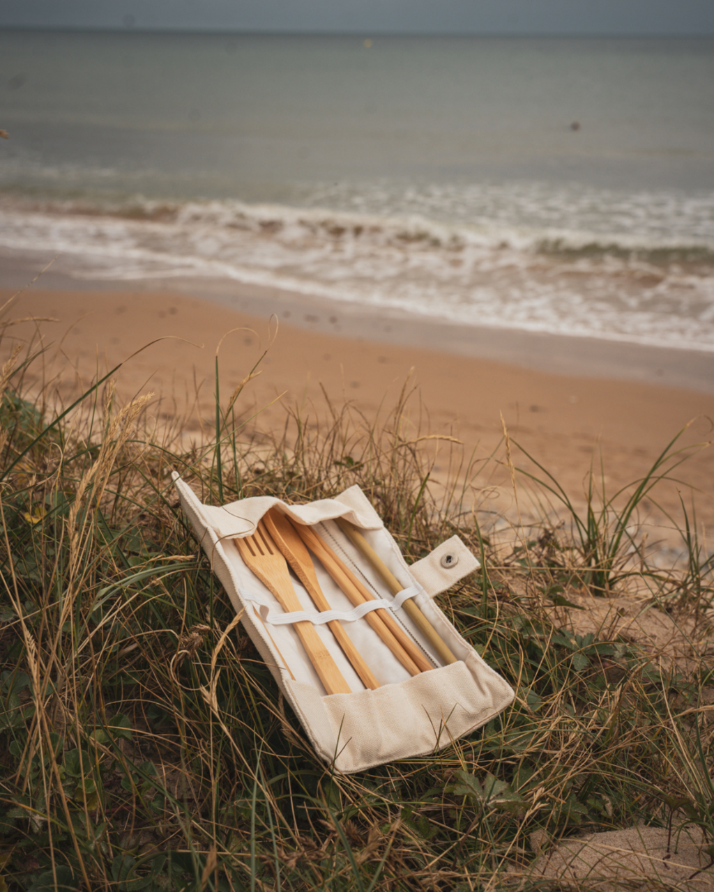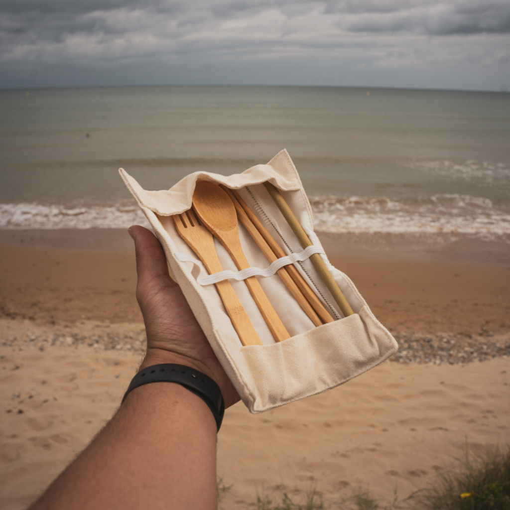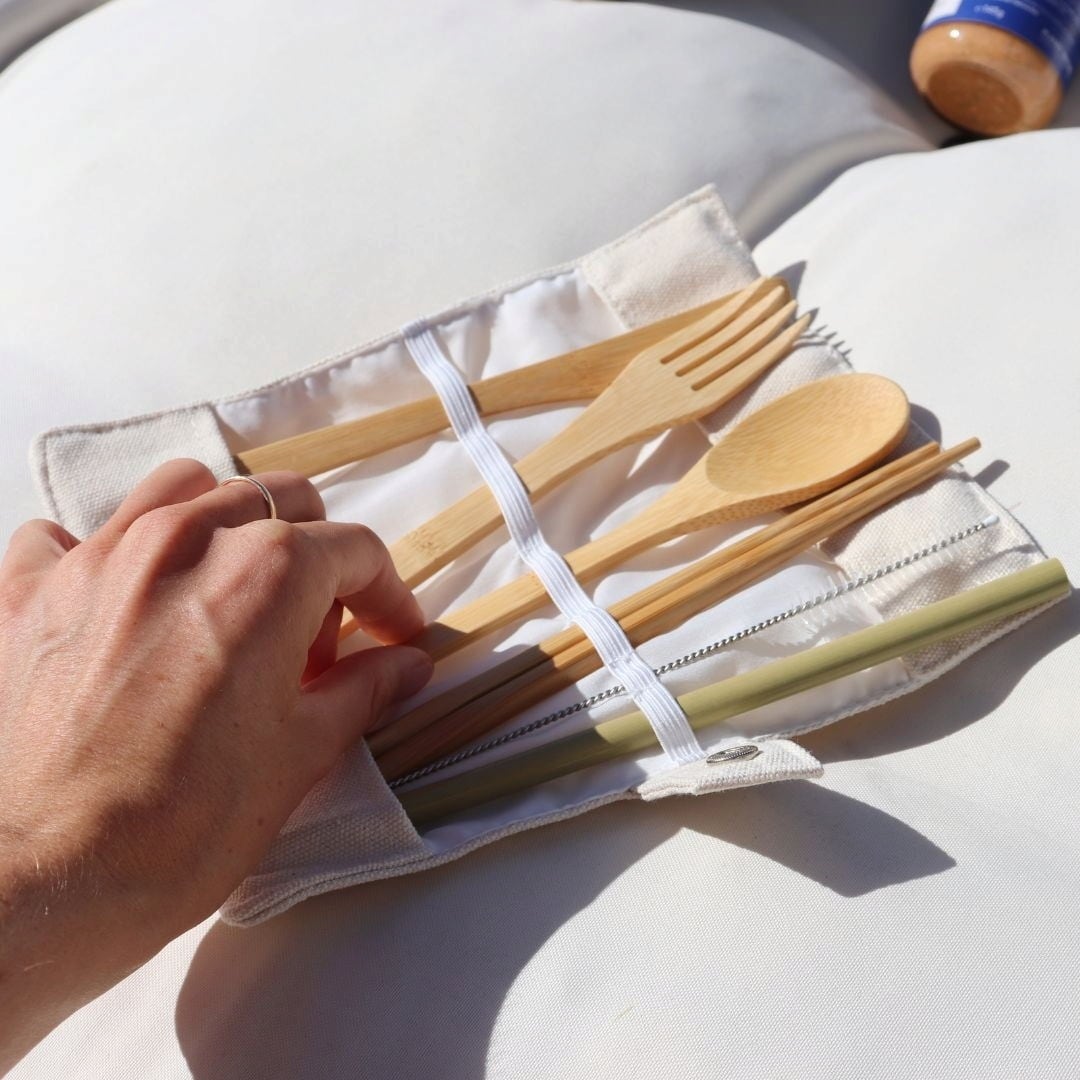 Het bevat eetstokjes, een vork, een mes, een lepel, een herbruikbaar rietje en een schoonmaakborstel, allemaal gemaakt van natuurlijke materialen en opgeborgen in een compacte etui. Zo kun je van jouw maaltijd genieten zonder het milieu te schaden!