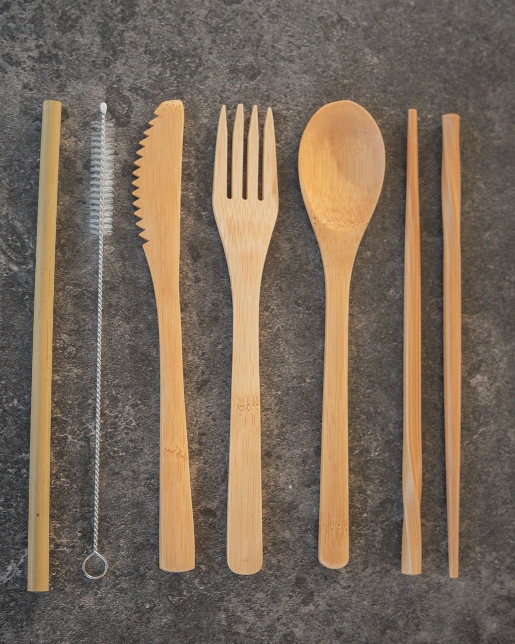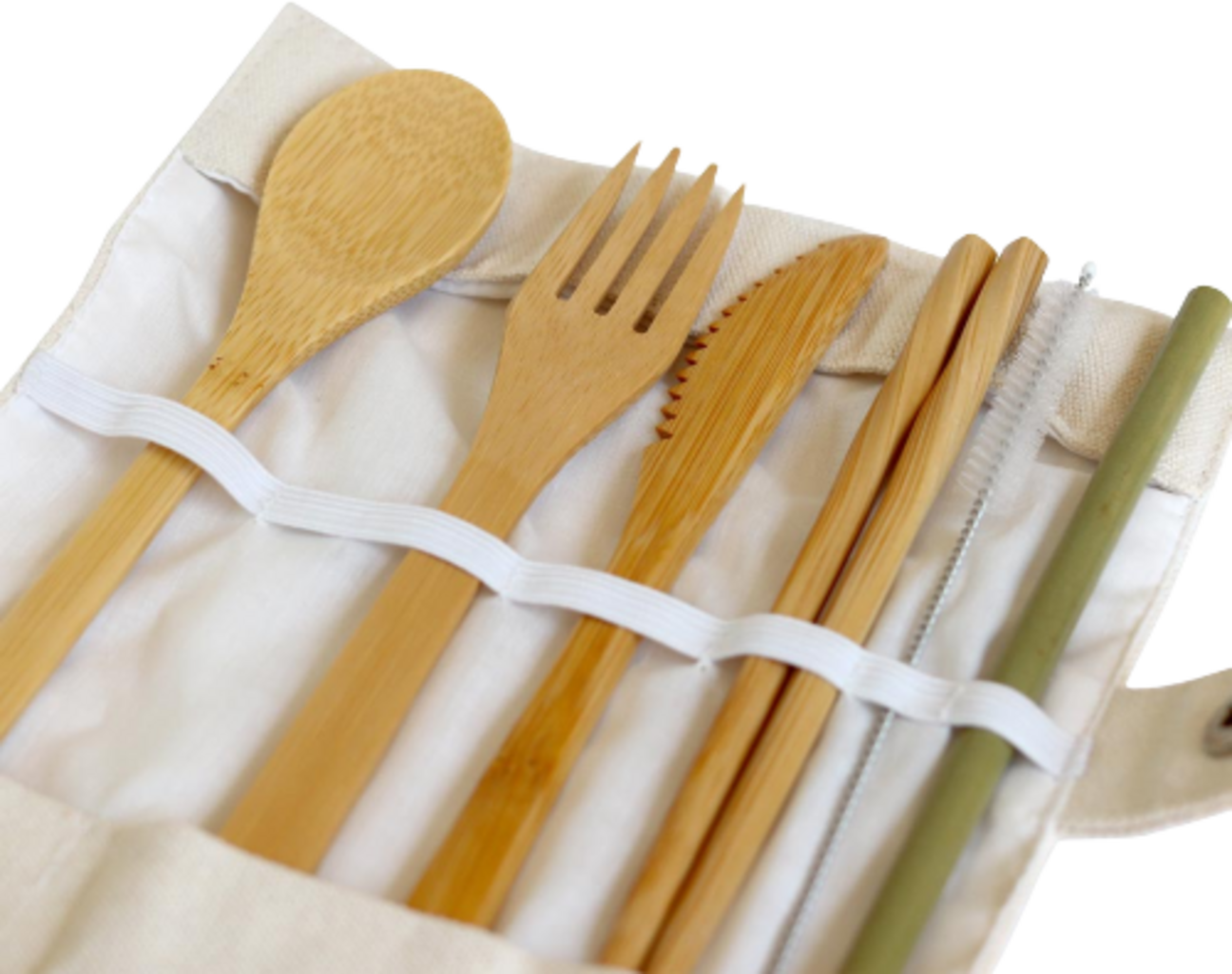 Inhoud: 1 bamboe mes, 1 bamboe vork, 1 bamboe lepel, 1 paar eetstokjes, 1 bamboe rietje, 1 schoonmaakborstel