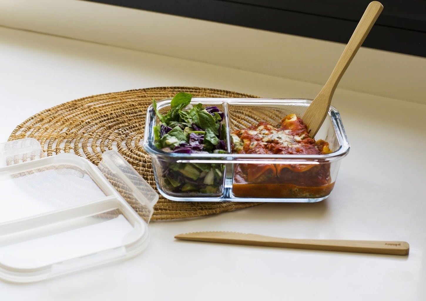 Het glazen bakje is vaatwasser-, oven- en magnetronbestendig, de deksel niet.