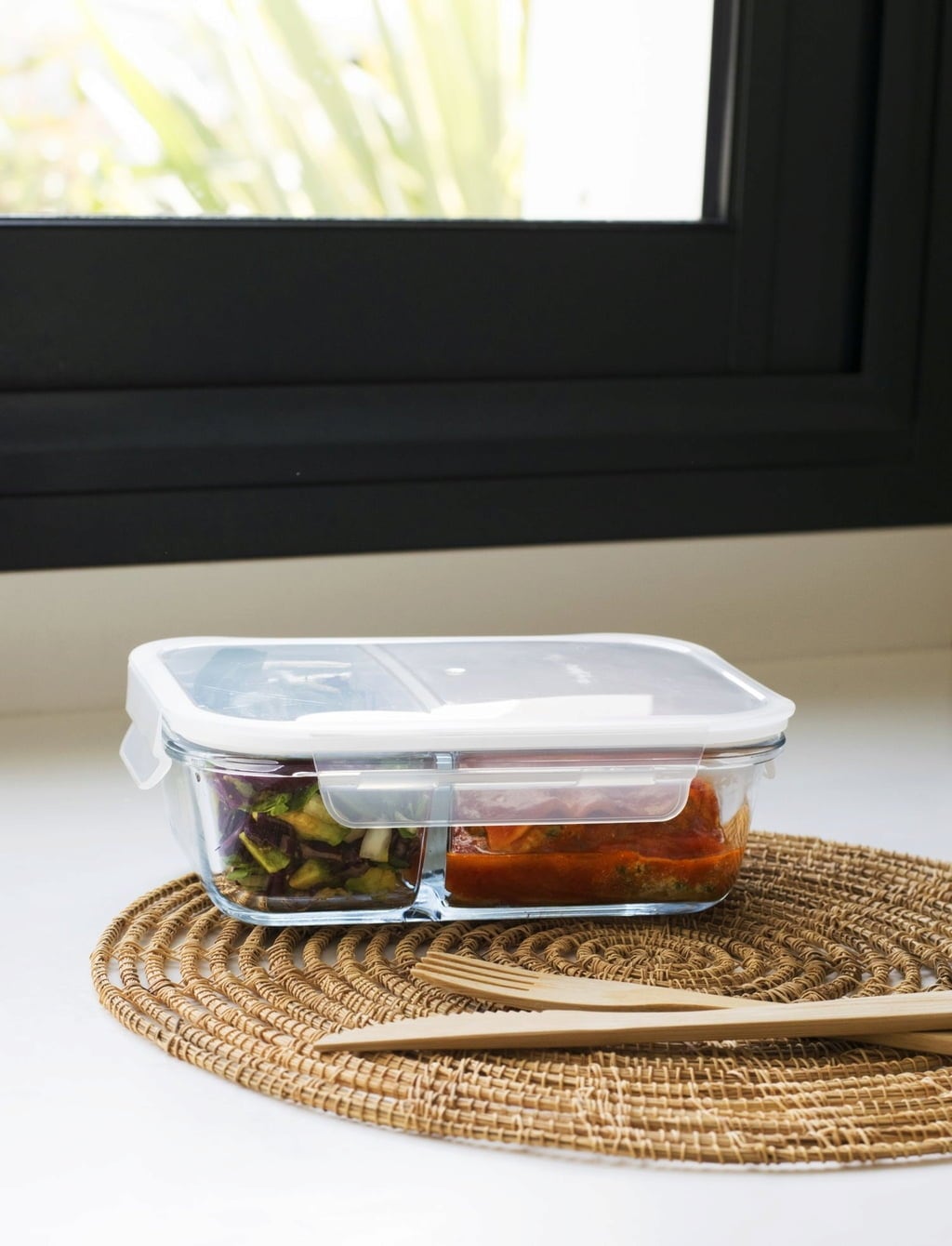 Dit vershoudbakje bestaat uit twee vaste compartimenten waardoor je de verschillende componenten van je eten gemakkelijk van elkaar kunt scheiden of hoofd- en nagerecht in één bak kunt meenmen - ideaal voor op kantoor of heerlijke picknicks!