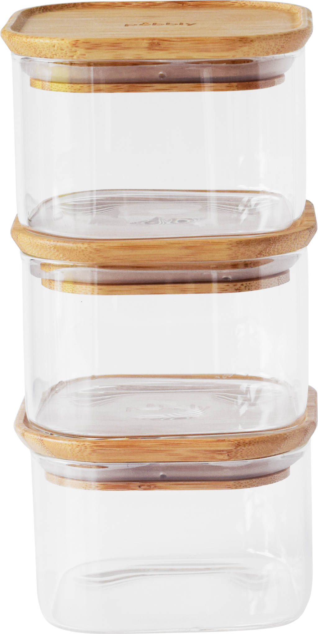 Deze set bevat drie voorraadbakjes met elk een inhoud van 500 ml. De containers zelf zijn gemaakt van robuust borosilicaatglas, de deksels zijn gemaakt van bamboe en hebben een afneembare siliconen afdichting.