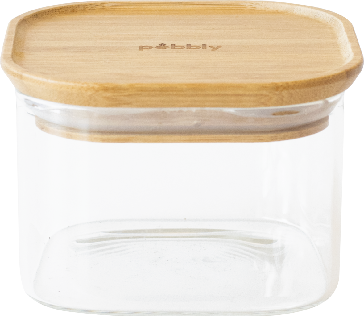 Dit voorraadbakje heeft een inhoud van 500 ml. Het bakje zelf is gemaakt van robuust borosilicaatglas, de deksel is van bamboe en heeft een afneembare siliconen afdichting.