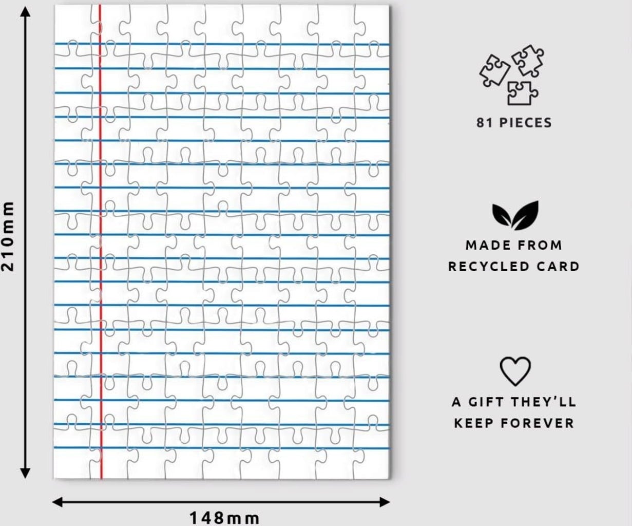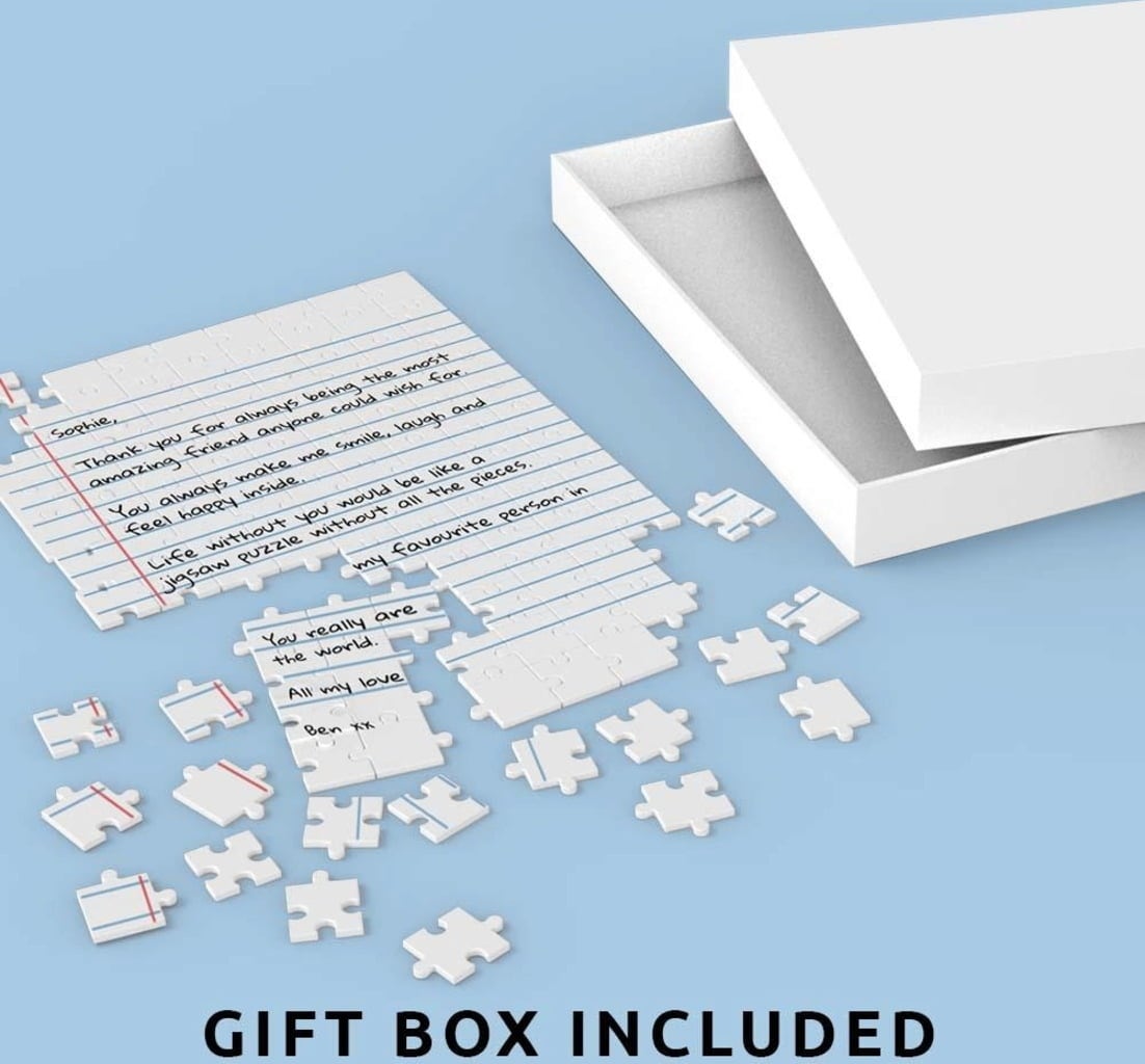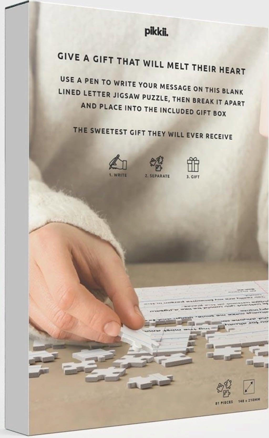 Een uniek persoonlijk cadeau dat niet alleen puzzelfans zal bekoren, maar ook geliefden keer op keer zal betoveren met persoonlijke woorden of een foto. De geschenkset bevat een 81-delige puzzel van stevig karton, die individueel gelabeld kan worden met de bijgeleverde permanente marker.