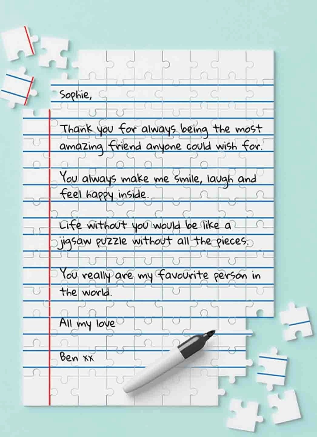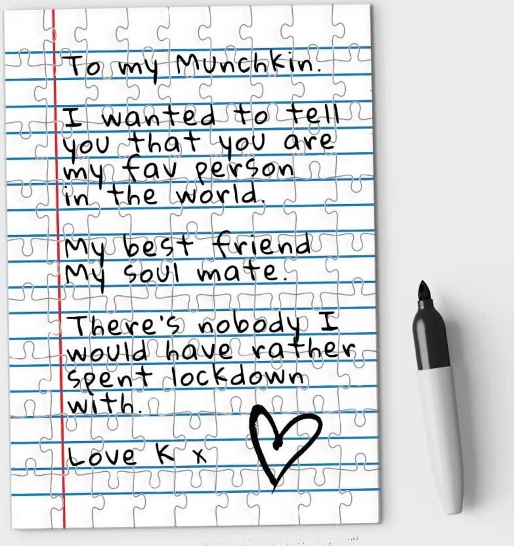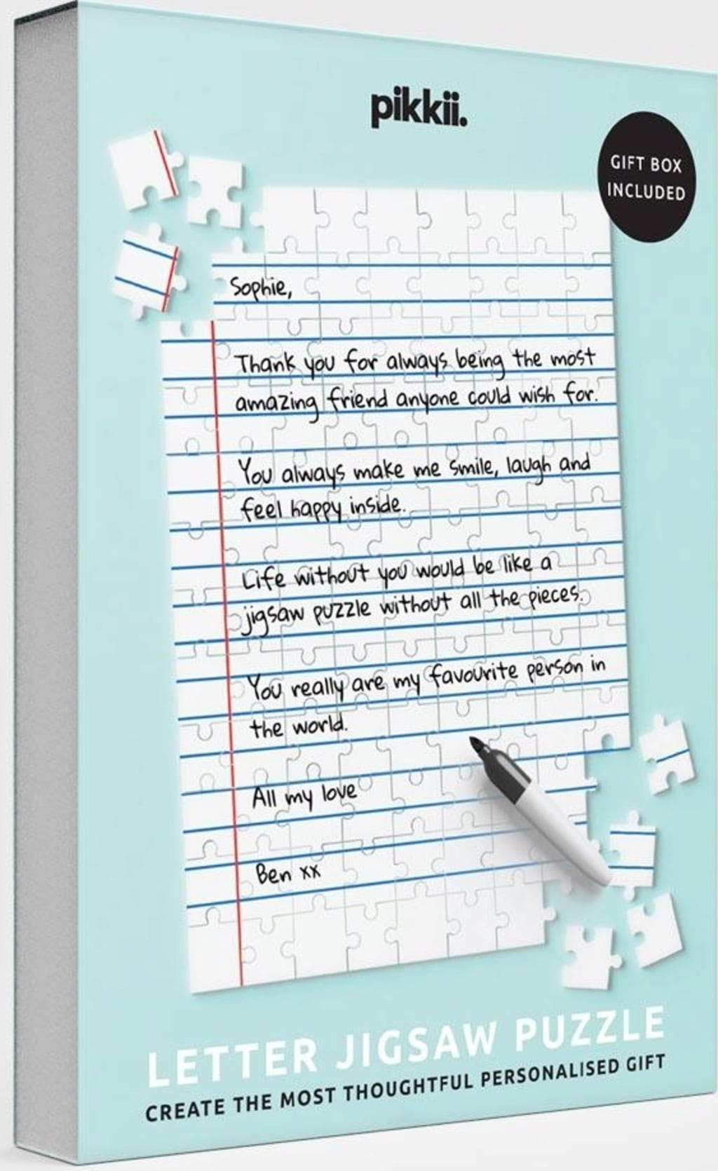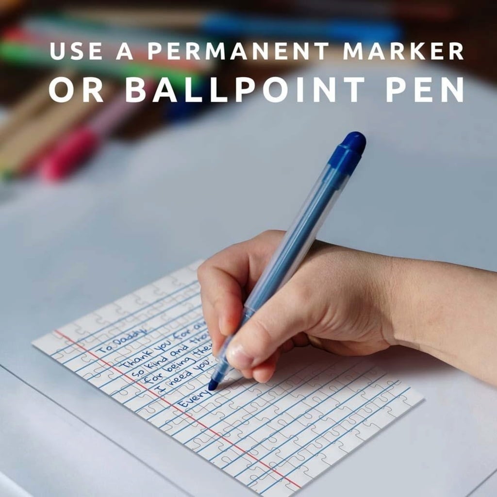 Een uniek persoonlijk cadeau dat niet alleen puzzelfans zal bekoren, maar ook geliefden keer op keer zal betoveren met persoonlijke woorden of een foto. De geschenkset bevat een 81-delige puzzel van stevig karton, die individueel gelabeld kan worden met de bijgeleverde permanente marker.