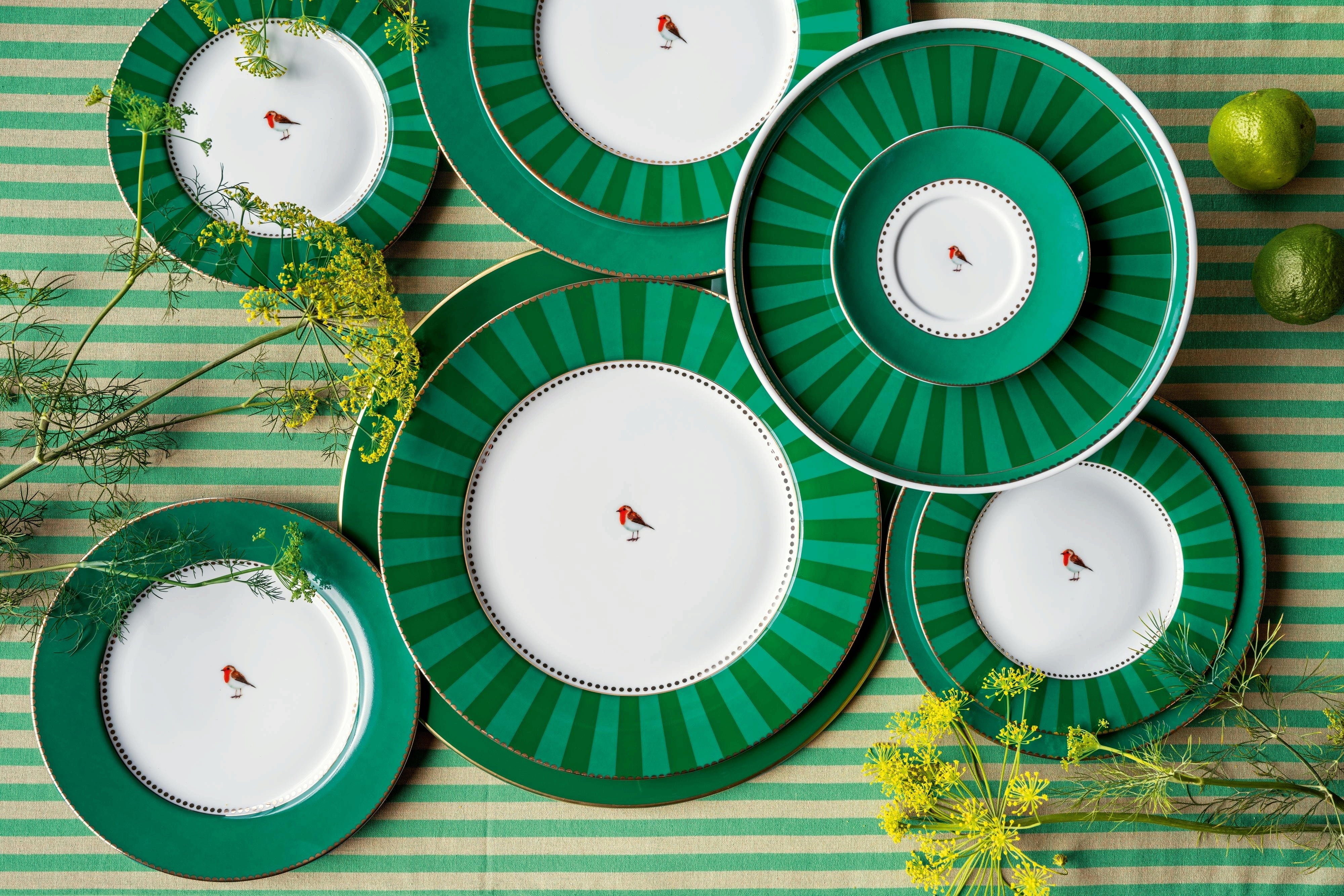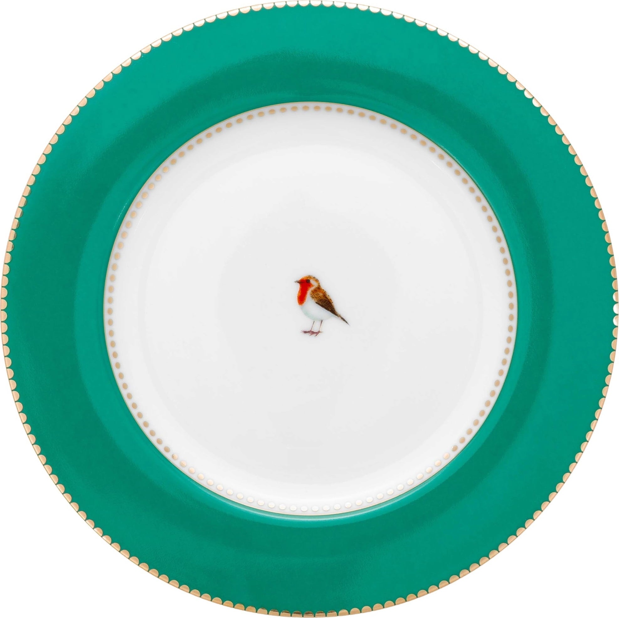 Met deze schattige bordjes van Pip Studio kun je de tafel prachtig dekken! Een groene rand en gouden details omlijsten het schattige roodborstje in het midden en creëren een even elegant als vertederend ontwerp. Het bord is gemaakt van fijn porselein, is een chique blikvanger op elke eettafel en is ook ideaal om te combineren met andere producten uit de Love Birds collectie!