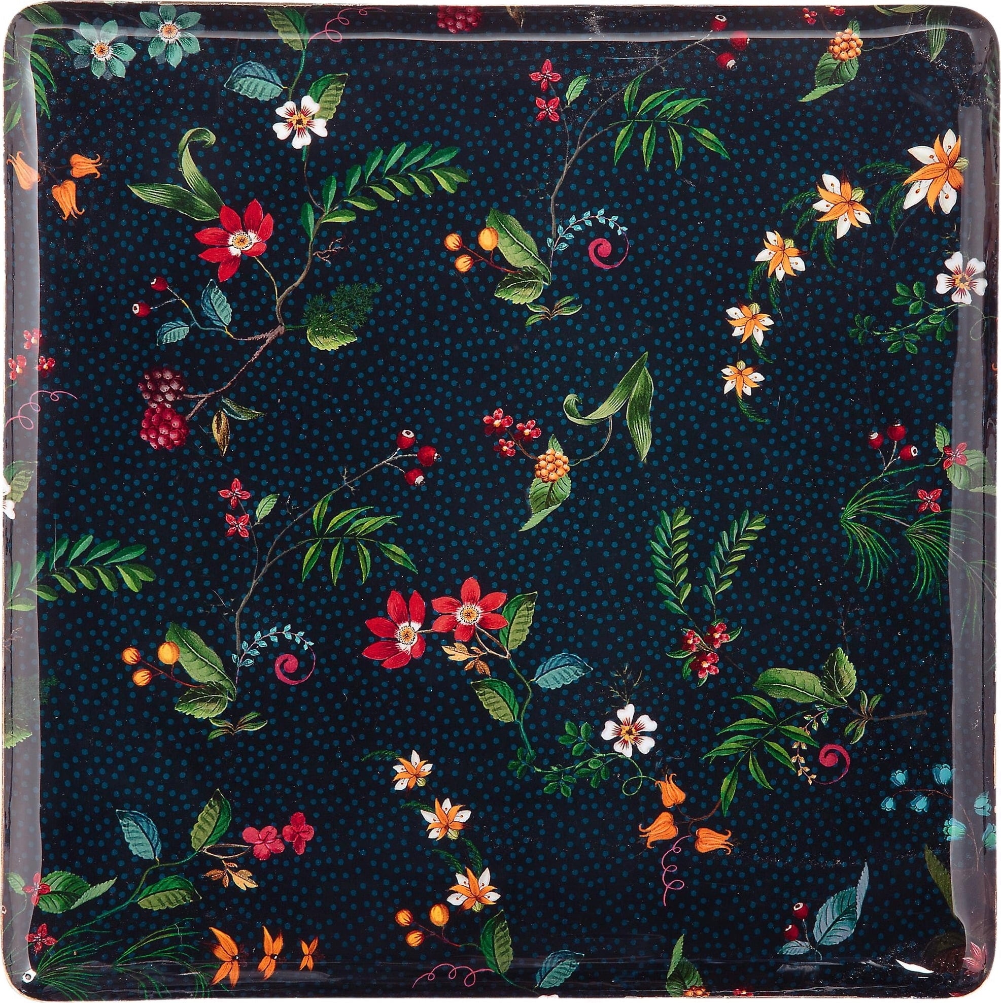 Dit dienblad is versierd met een donkerblauw bloemenpatroon dat zich over het hele oppervlak uitstrekt. Het elegante ontwerp bestaat uit fantasievolle bloemen en bessen die een sierlijk patroon vormen. Met zijn elegante ontwerp is het dienblad gegarandeerd een blikvanger!