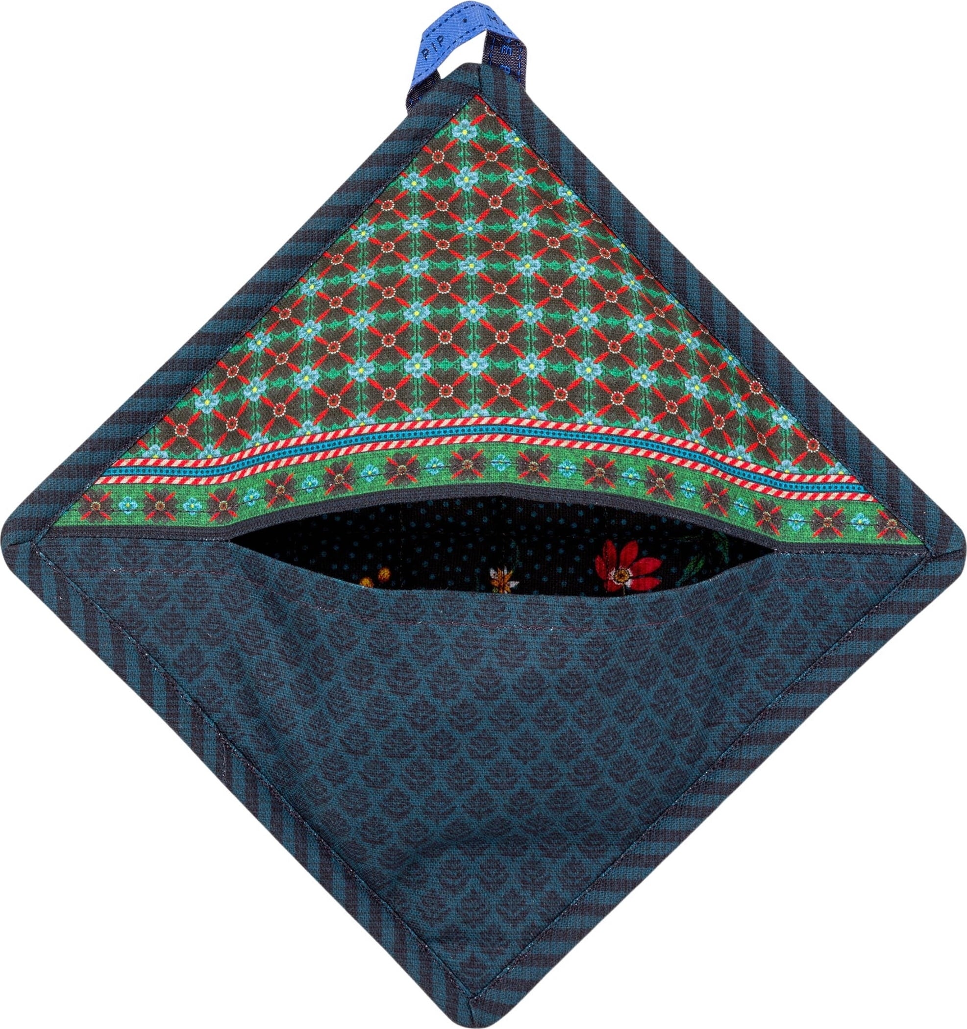 Bescherm je handen tijdens het koken en bakken met deze prachtige pannenlap van Pip Studio! Het verfijnde en gelaagde design maakt hem tot een echte blikvanger. De bovenste helft heeft een levendig, geometrisch patroon met kleine, gestileerde bloemen in heldere turquoise- en roestrode tinten op een lichtere petrolkleurige achtergrond. Het onderste deel van de pannenlap, dat tevens als insteek voor de hand dient, is uitgevoerd in diep marineblauw en versierd met een delicaat, bloemmotief. De randen zijn afgewerkt met een gestreepte bies in marineblauw.