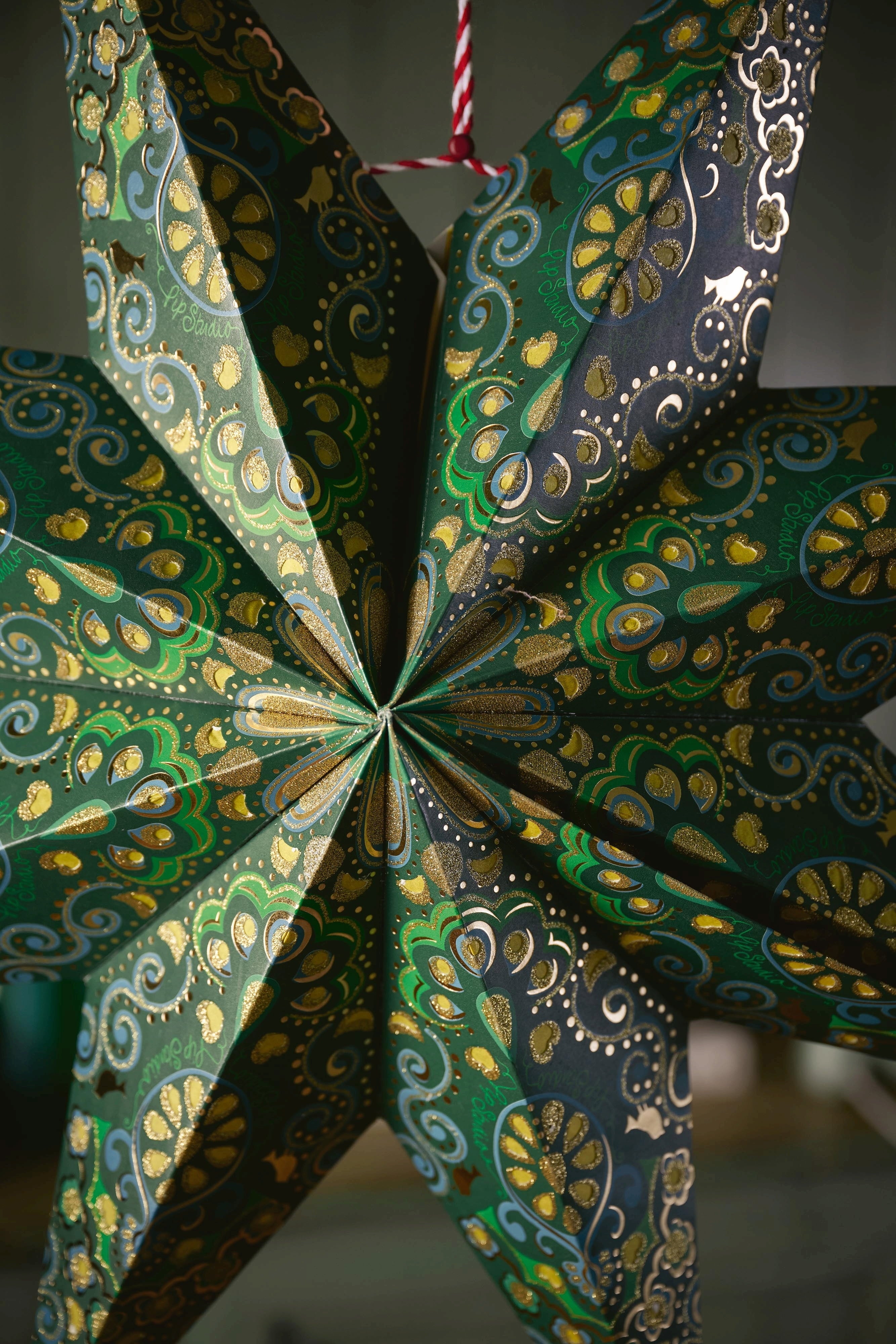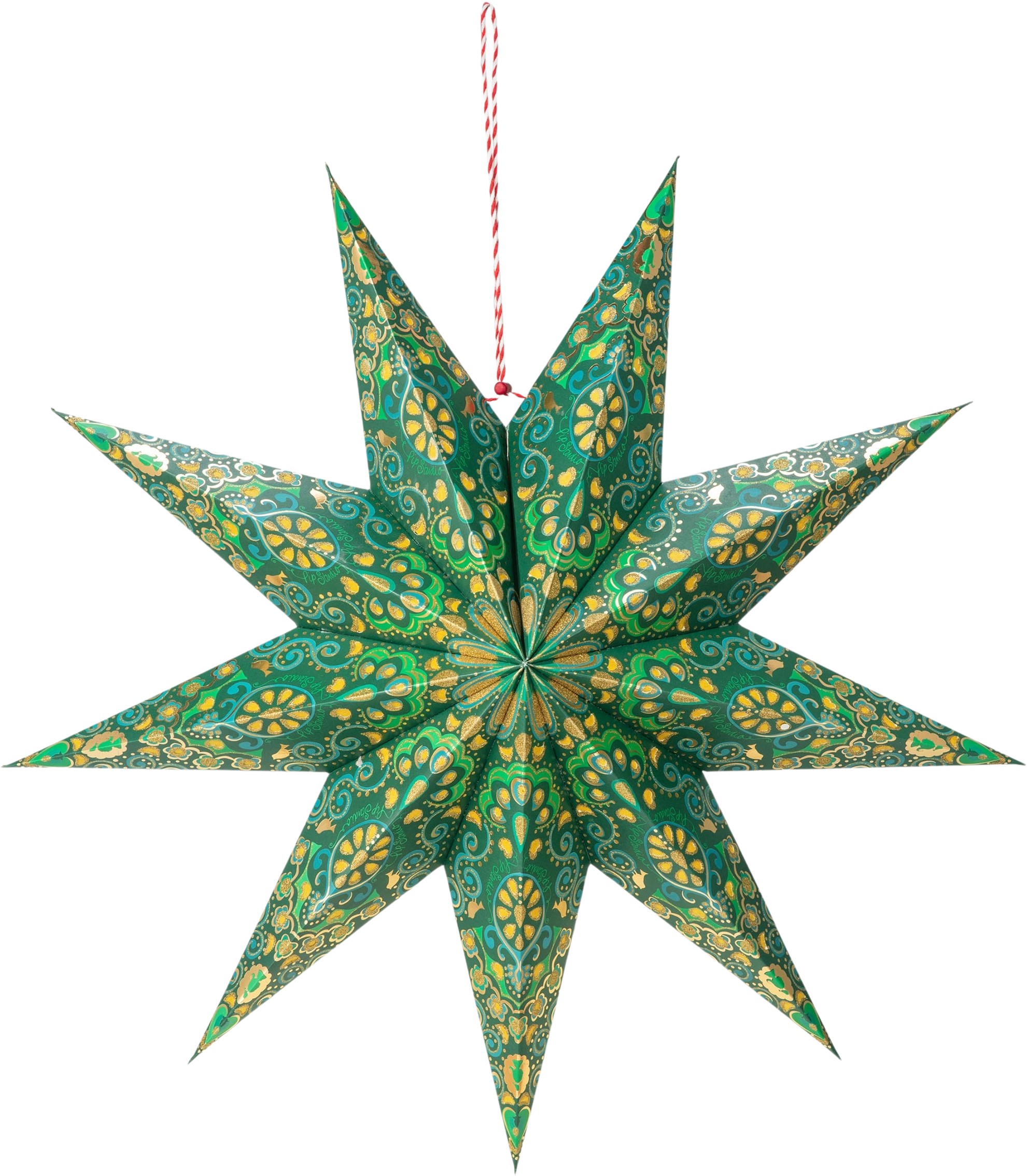 Hij valt op door zijn elegante en verfijnde design, met een diepe, stijlvolle groene tint als basis. Verfijnde patronen in luxueus goud en dieper rood geven het ontwerp zijn feestelijke uitstraling. De zorgvuldig gevouwen, spitse punten zorgen voor een indrukwekkende driedimensionale diepte en een gracieuze vorm.